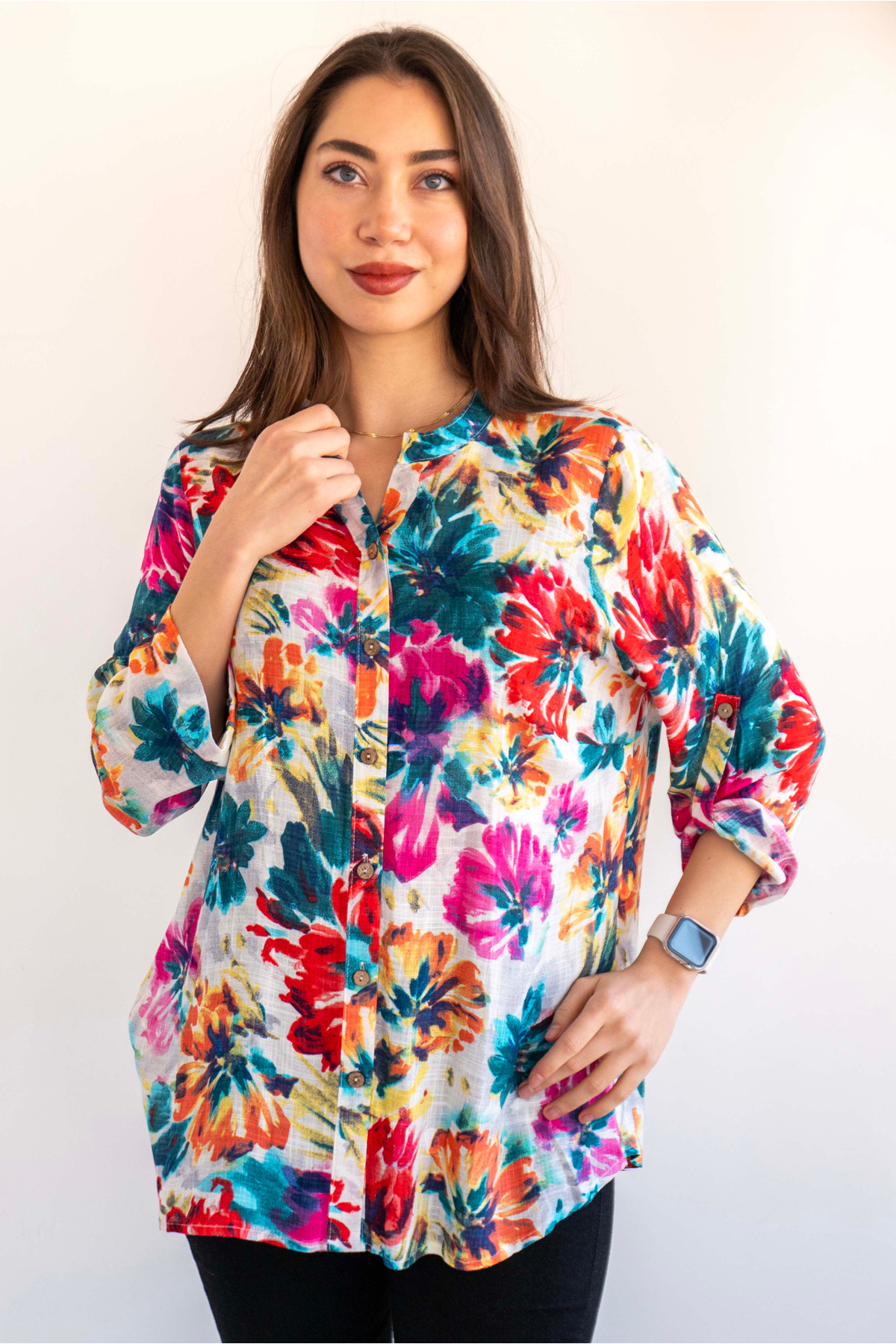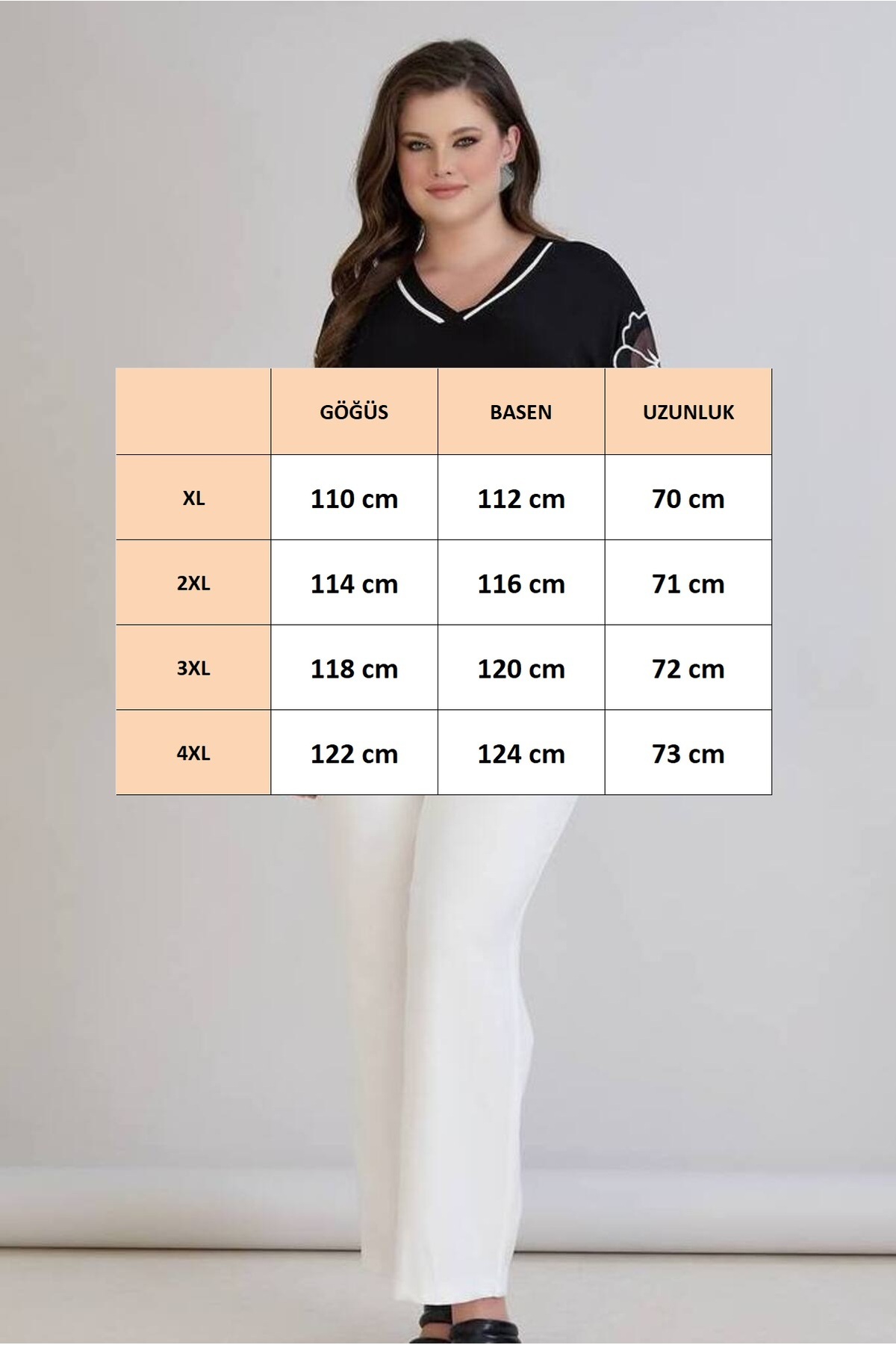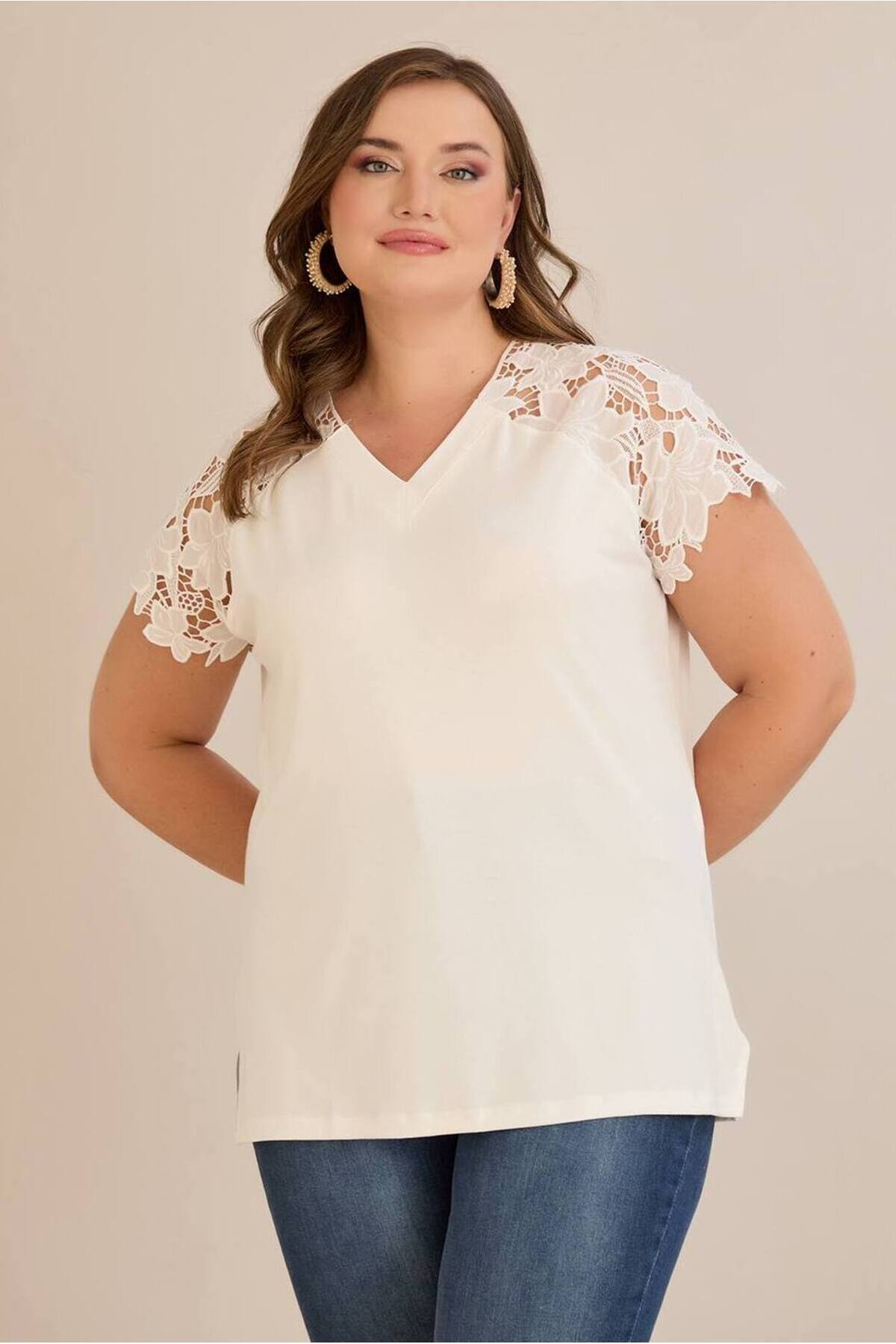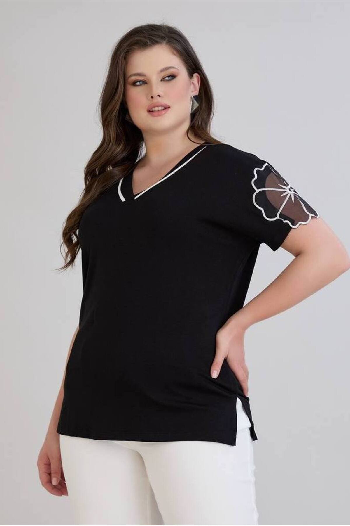 Kadın Büyük Beden V Yaka Beyaz Şerit Kol Tül Büyük Çiçek Detay Yan Yırtmaç Esnek Viskon Bluz Kadın Büyük Beden V Yaka Beyaz Şerit Kol Tül Büyük Çiçek Detay Yan Yırtmaç Esnek Viskon Bluz BT25YB458239 4XL