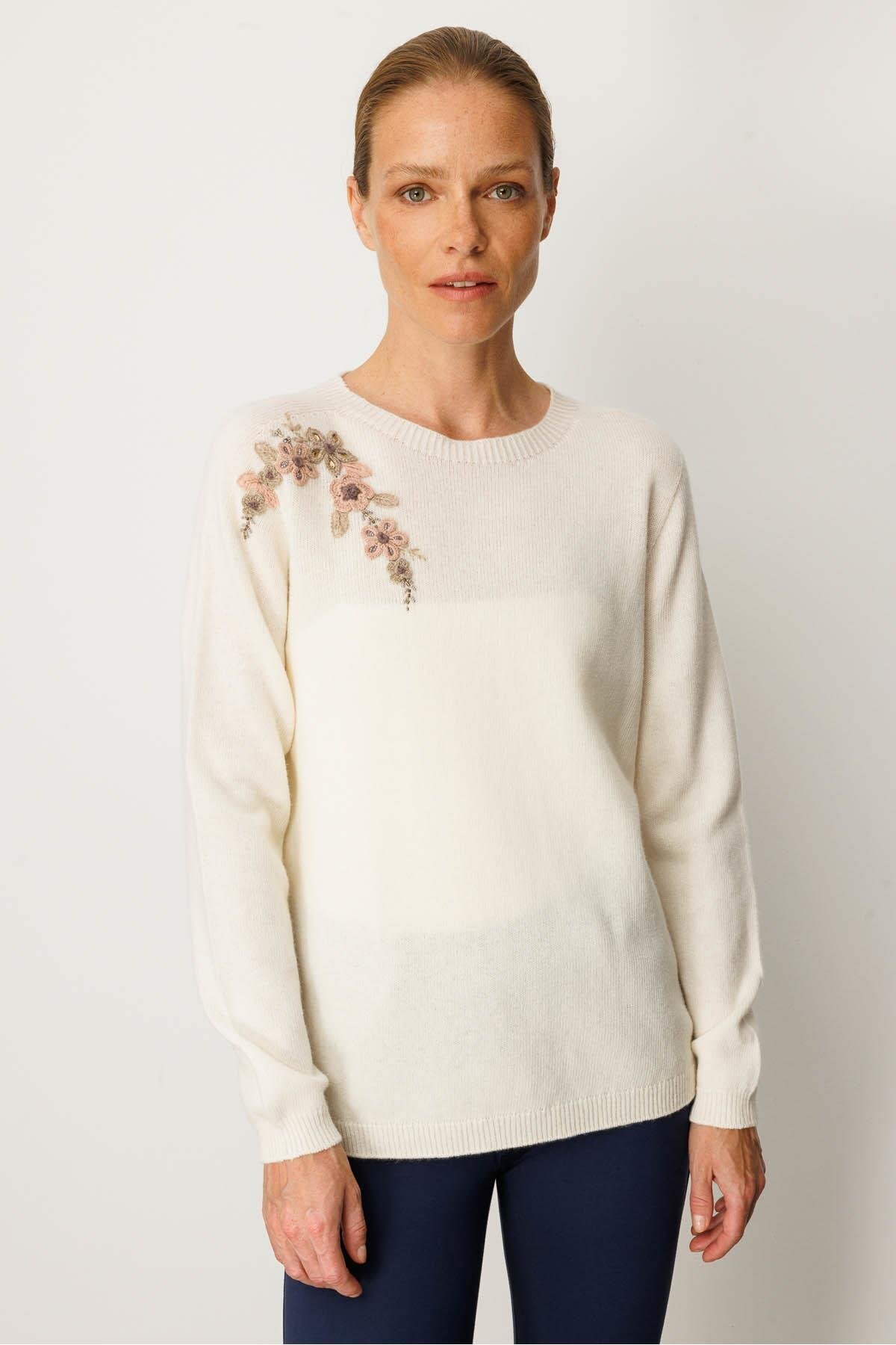 Kadın Sıfır Yaka Omuzu İşlemeli Yün Kazak Kemik Kadın Sıfır Yaka Omuzu İşlemeli Yün Kazak Kemik 25204 2XL