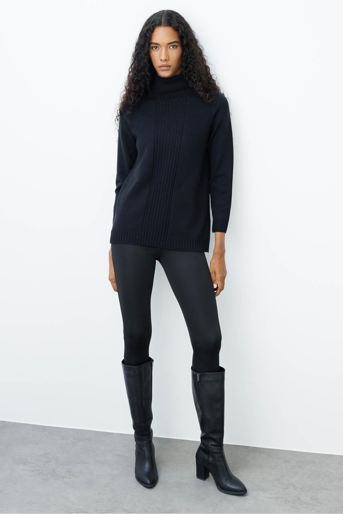 Kadın Tam Balıkçı Yaka Önü Uzun Çizgili Kazak Siyah Kadın Tam Balıkçı Yaka Önü Uzun Çizgili Kazak Siyah 25251 XL