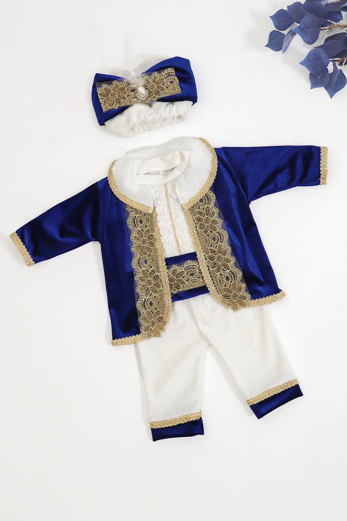 Erkek Bebek Şık Mevlütlük ve Sünnetlik Tulum ve Şapka Seti – Altın İşlemeli Erkek Bebek Şık Mevlütlük ve Sünnetlik Tulum ve Şapka Seti – Altın İşlemeli pnpn0515 6-9 AY