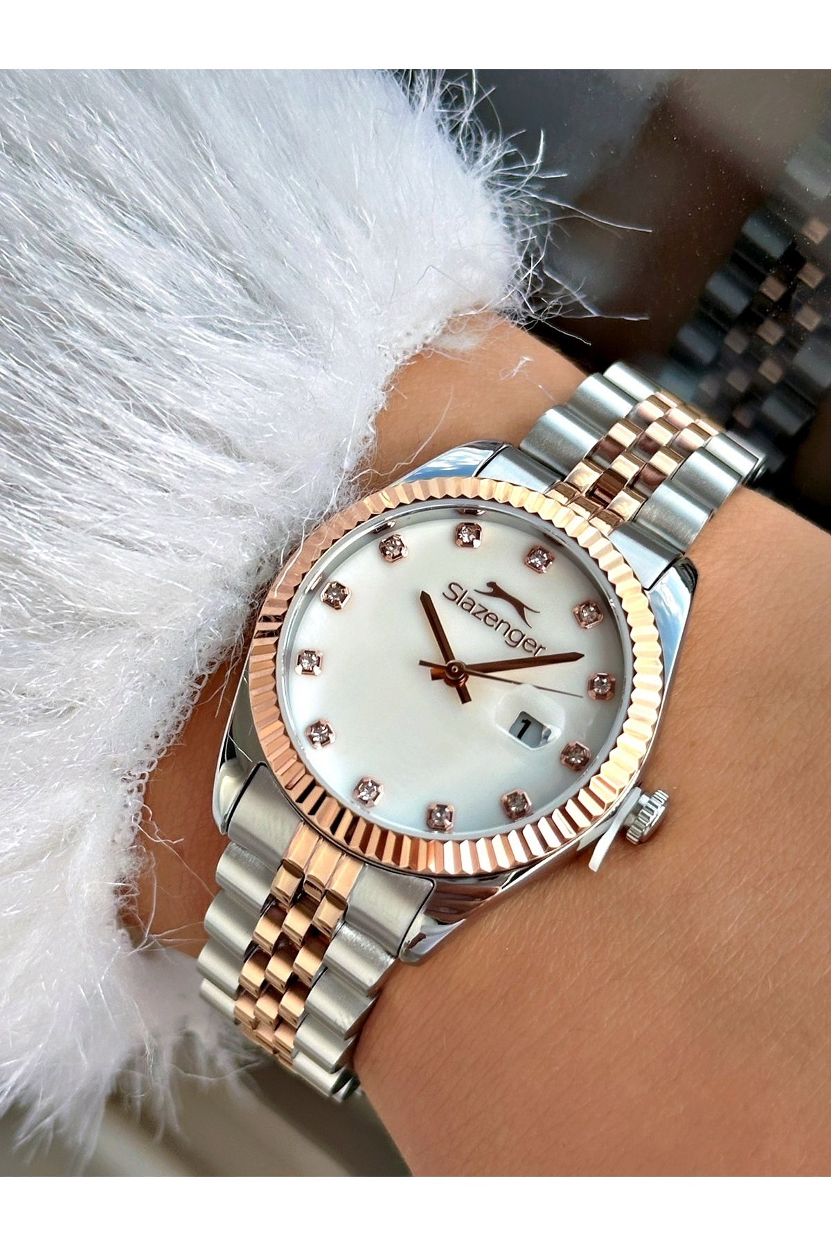 Çelik Kordon Takvimli 5 Atm Su Geçirmez Gümüş-Bakır Renk Kadın Kol Saati 2240 Çelik Kordon Takvimli 5 Atm Su Geçirmez Gümüş-Bakır Renk Kadın Kol Saati 2240 2240MR تک سایز