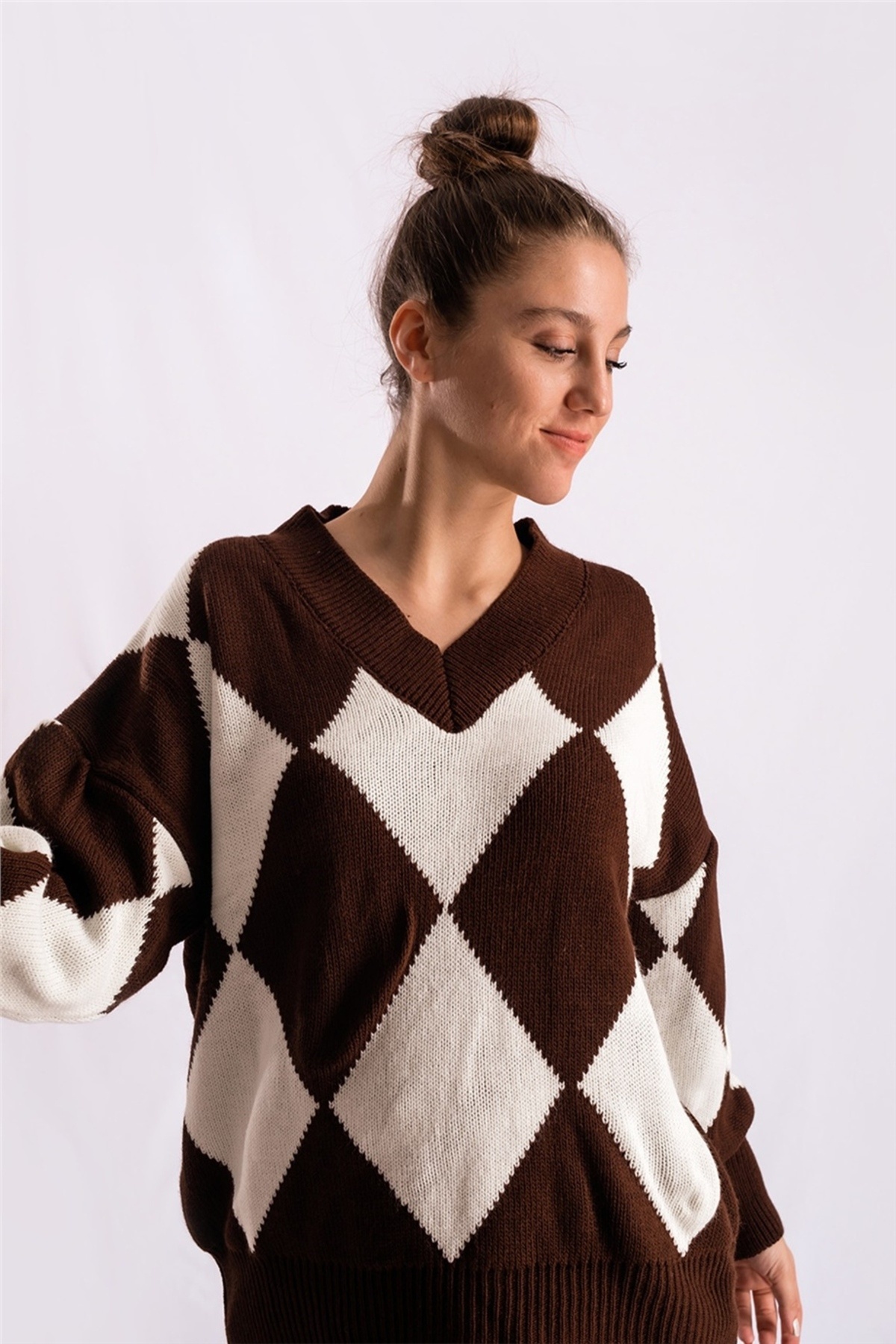 Baklava Desenli Yarım Düğmeli Polo Yaka Triko Kadın Kazak Baklava Desenli Yarım Düğmeli Polo Yaka Triko Kadın Kazak bklv1 L