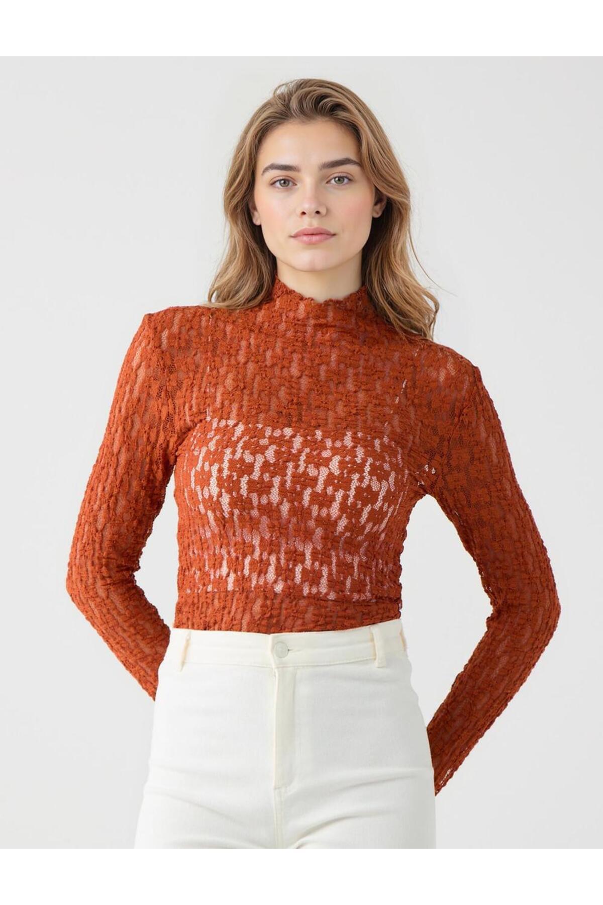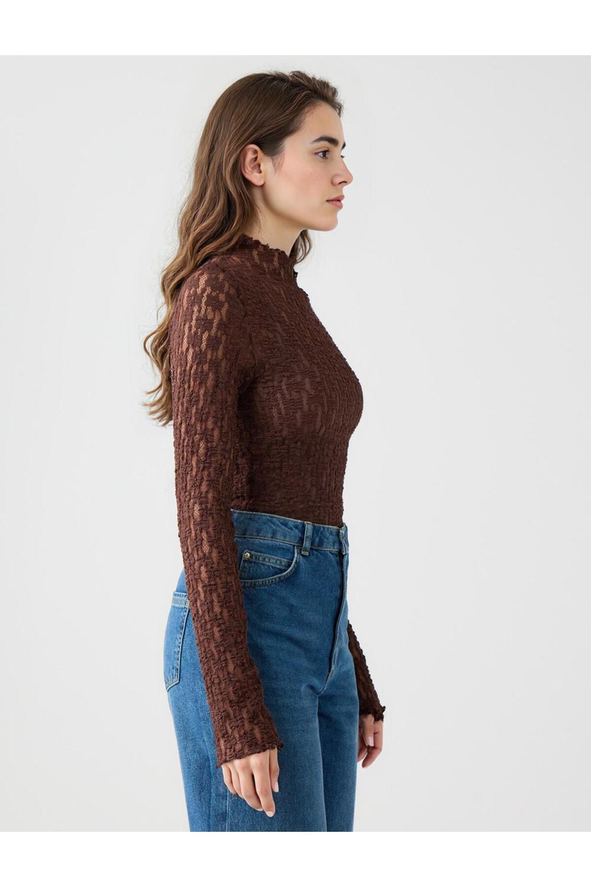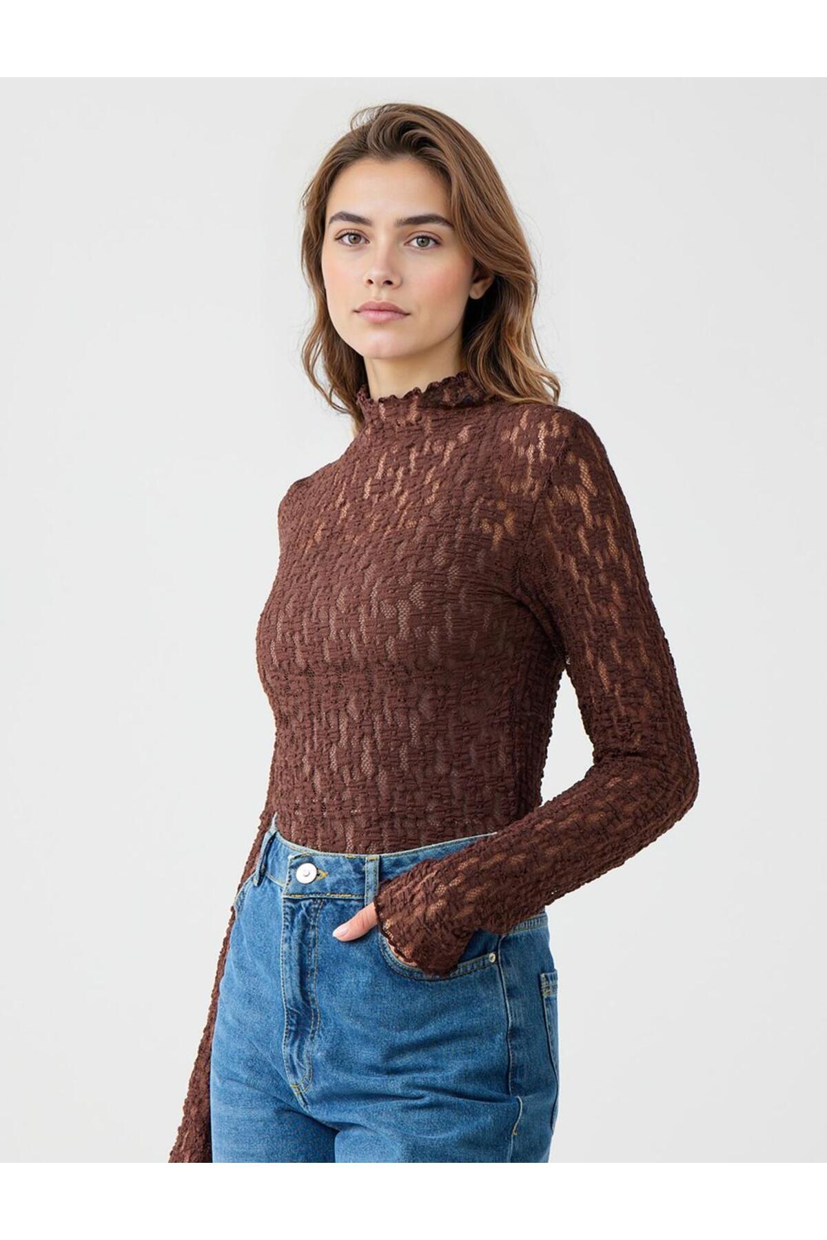 Acı Kahve Dar Kesim Uzun Kollu Dantelli Örme Bluz Acı Kahve Dar Kesim Uzun Kollu Dantelli Örme Bluz 5WW035748 XL