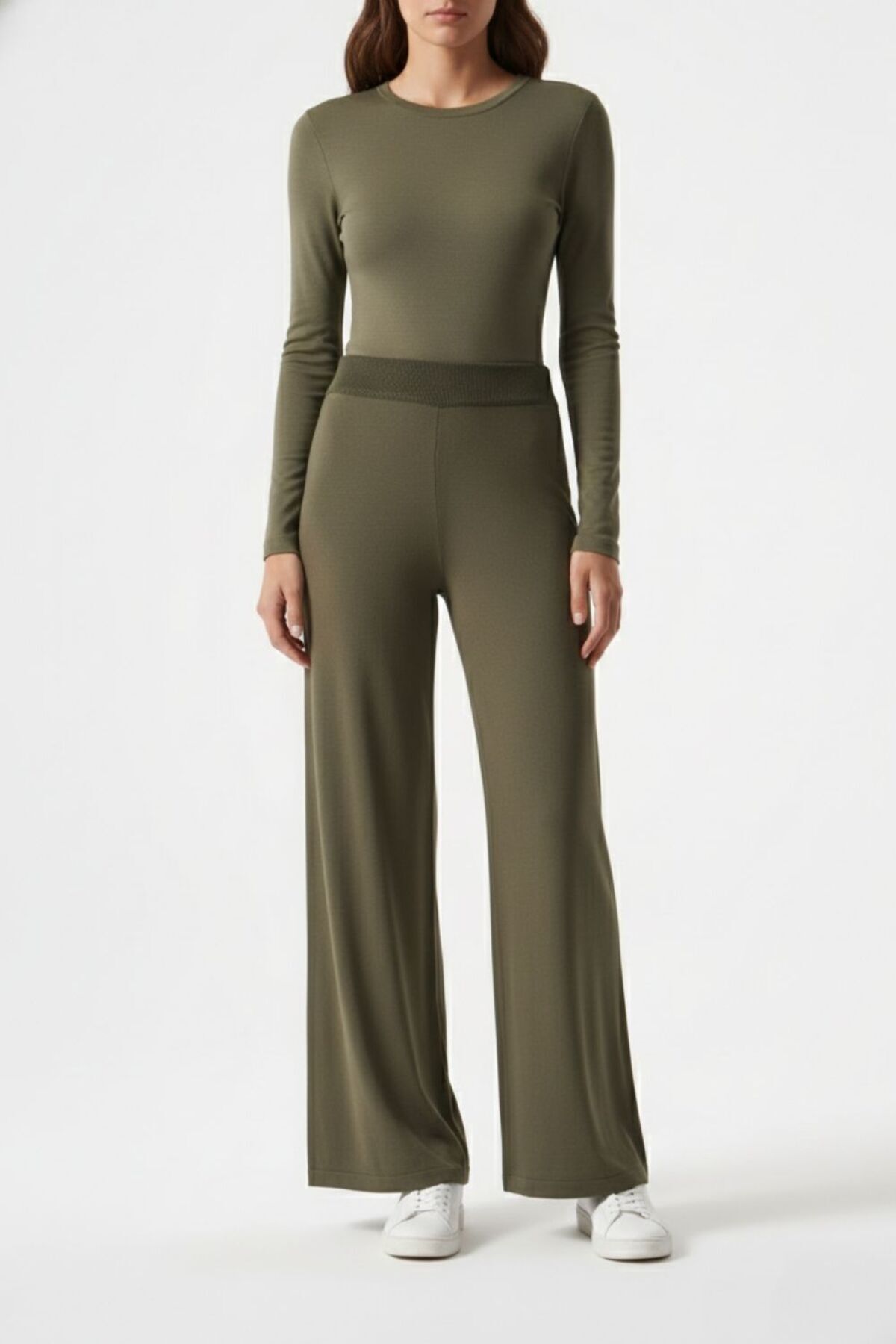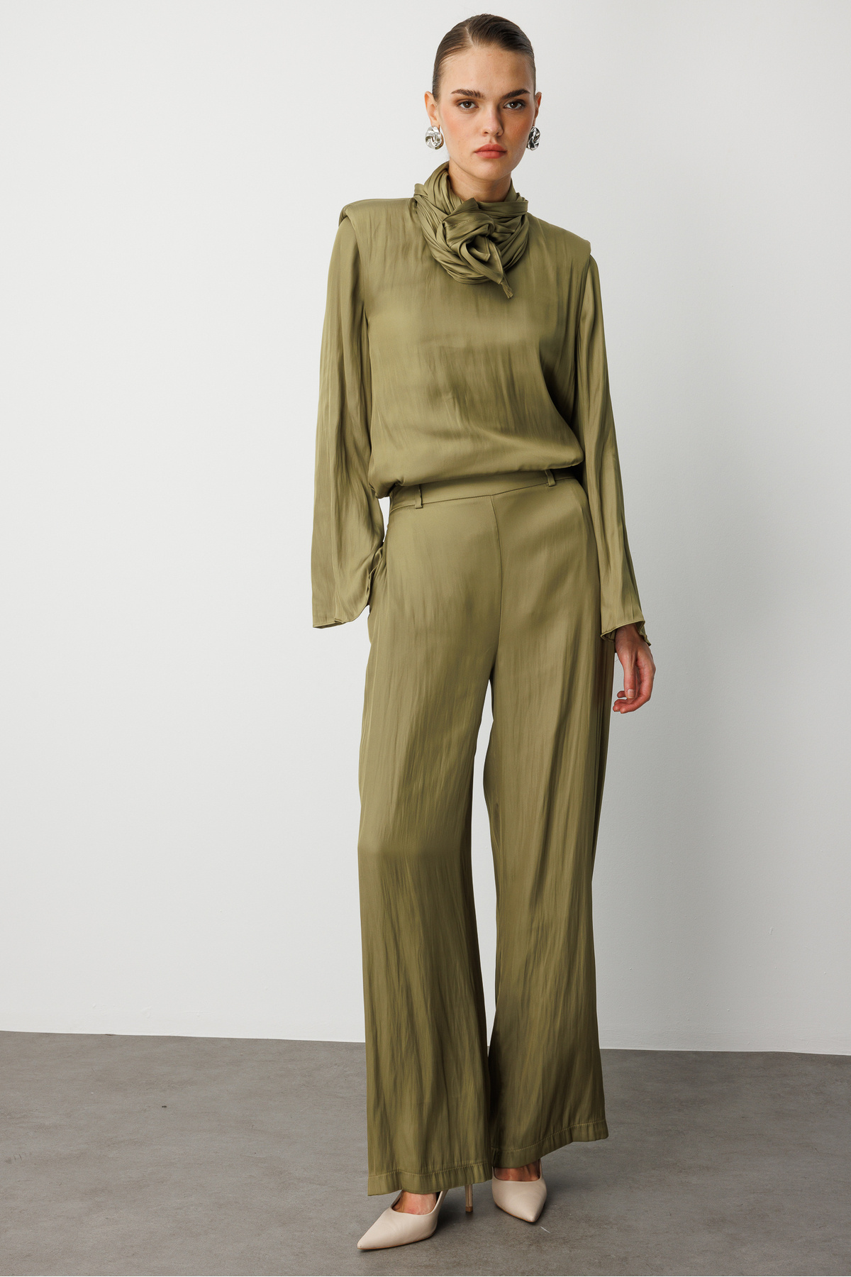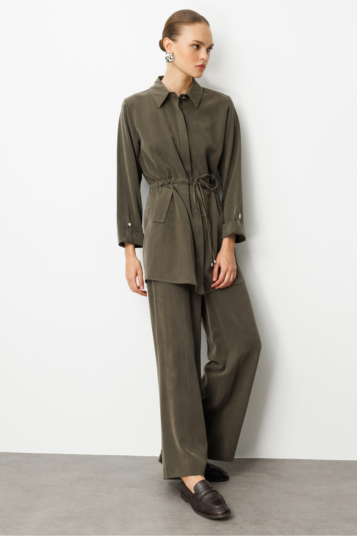 Geniş Paça beli Lastikli Haki Cupro Pantolon Geniş Paça beli Lastikli Haki Cupro Pantolon M1MZ1010130186 XL