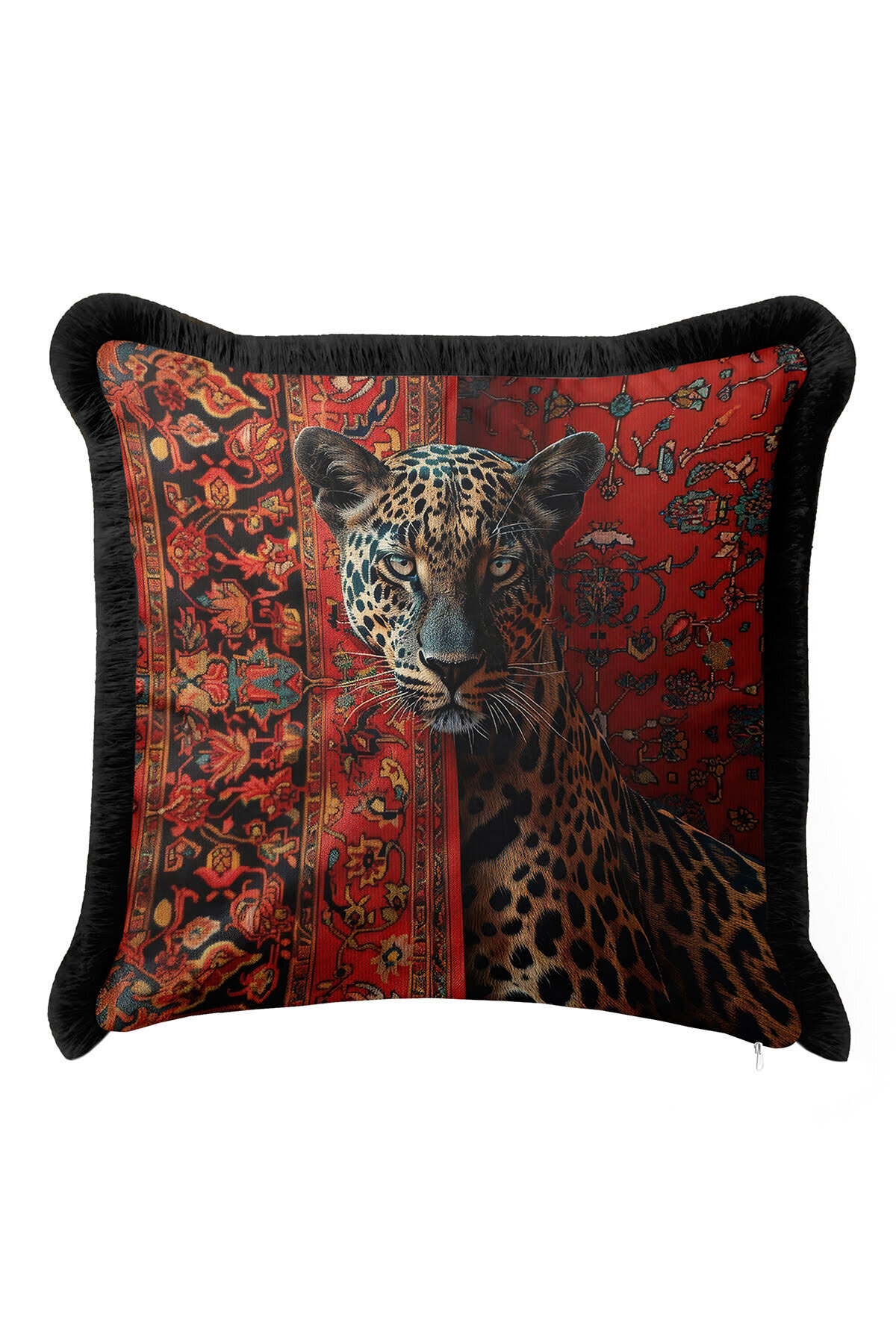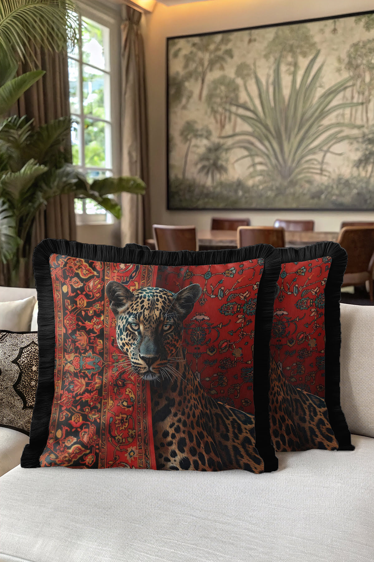 Gizemli Leopar Motifli Saçaklı Yastık Kılıfı-Kırmızı Siyah Etnik Desenli Püsküllü Kırlent Kılıfı Gizemli Leopar Motifli Saçaklı Yastık Kılıfı-Kırmızı Siyah Etnik Desenli Püsküllü Kırlent Kılıfı GRS2 40 x 40