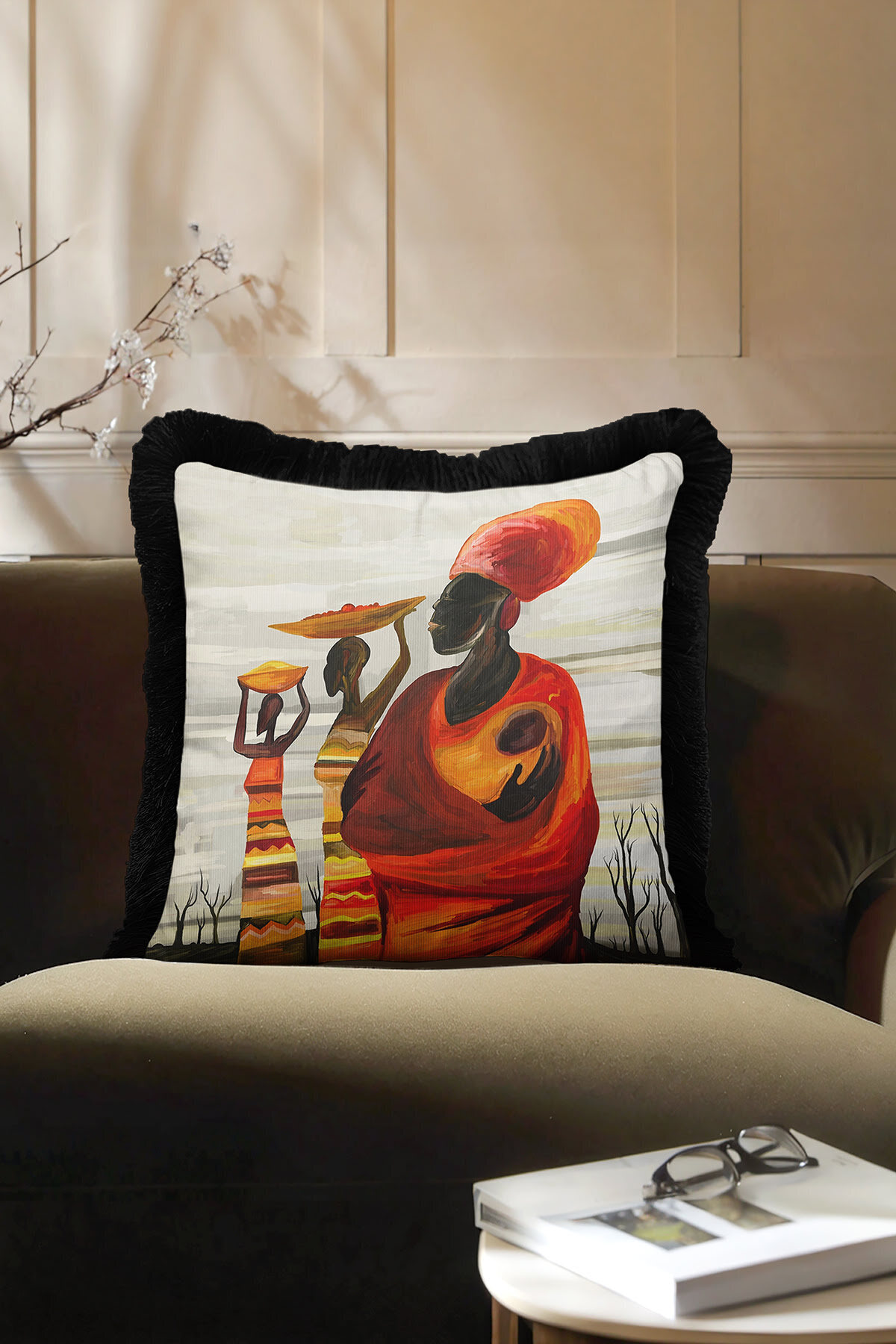 Etnik Afrikan Sanatı Saçaklı Yastık Kılıfı - Bohem Turuncu Siyah Püsküllü Kırlent Kılıfı Etnik Afrikan Sanatı Saçaklı Yastık Kılıfı - Bohem Turuncu Siyah Püsküllü Kırlent Kılıfı GRS60 40 x 40
