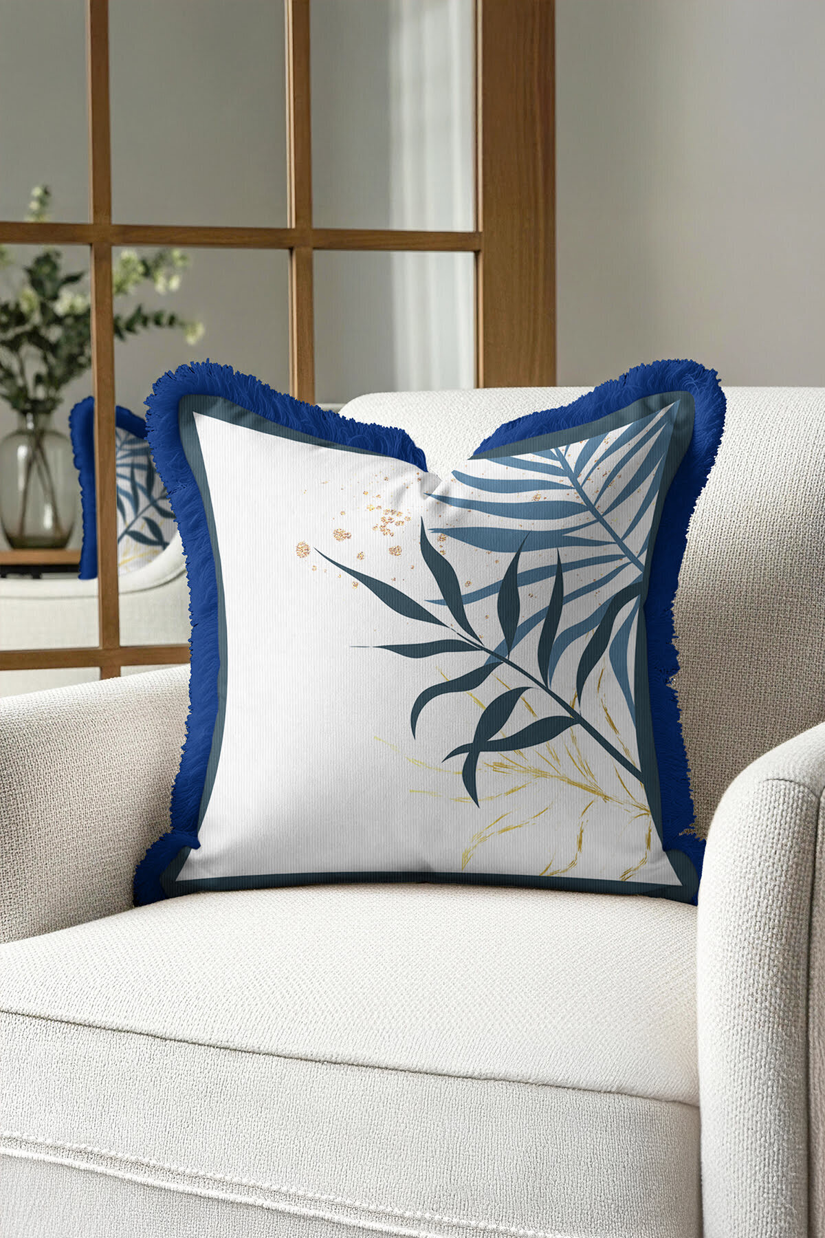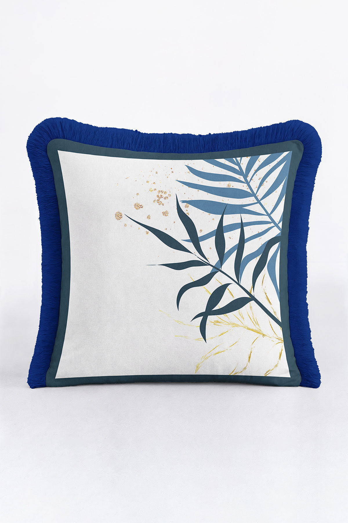Tropikal Yaprak Motifli Saçaklı Yastık Kılıfı - Botanik Modern Lacivert Püsküllü Kırlent Kılıfı Tropikal Yaprak Motifli Saçaklı Yastık Kılıfı - Botanik Modern Lacivert Püsküllü Kırlent Kılıfı GRS74 40 x 40