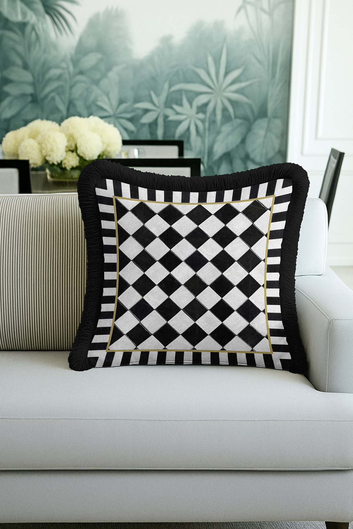 Lüks Geometrik Saçaklı Yastık Kılıfı - Monokrom Modern Altın Renkli Püsküllü Kırlent Kılıfı Lüks Geometrik Saçaklı Yastık Kılıfı - Monokrom Modern Altın Renkli Püsküllü Kırlent Kılıfı GRS82 40 x 40