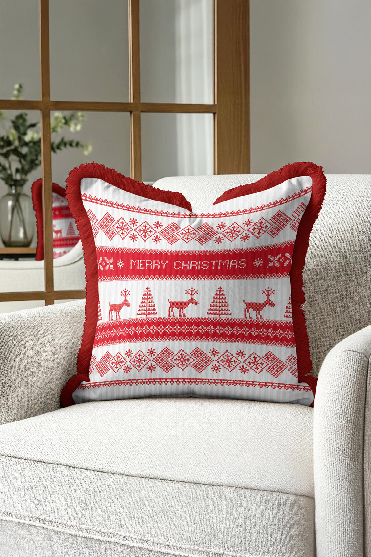 Nordik Noel Temalı Saçaklı Yastık Kılıfı - Vintage Kış Rustik Kırmızı Beyaz Püsküllü Kırlent Kılıfı Nordik Noel Temalı Saçaklı Yastık Kılıfı - Vintage Kış Rustik Kırmızı Beyaz Püsküllü Kırlent Kılıfı GRS54 40 x 40