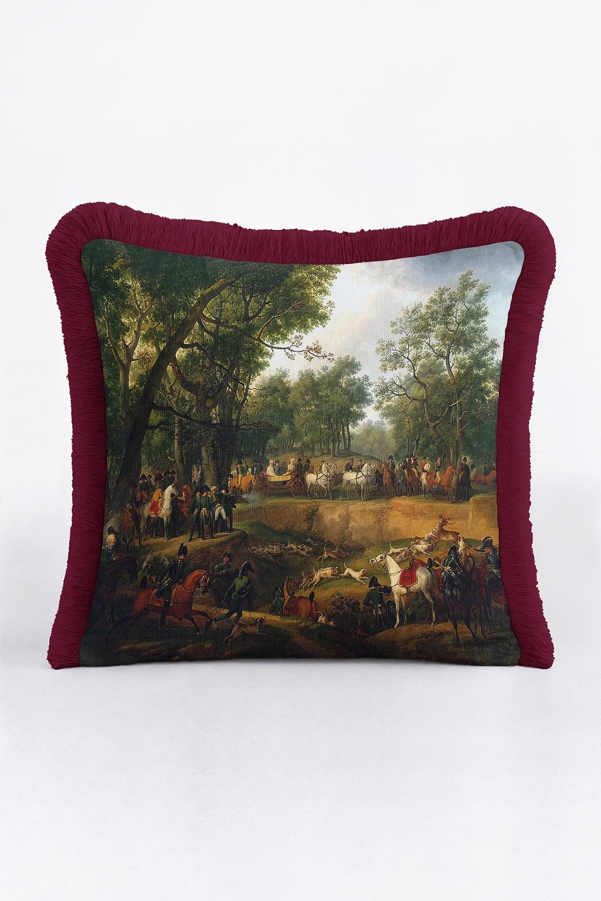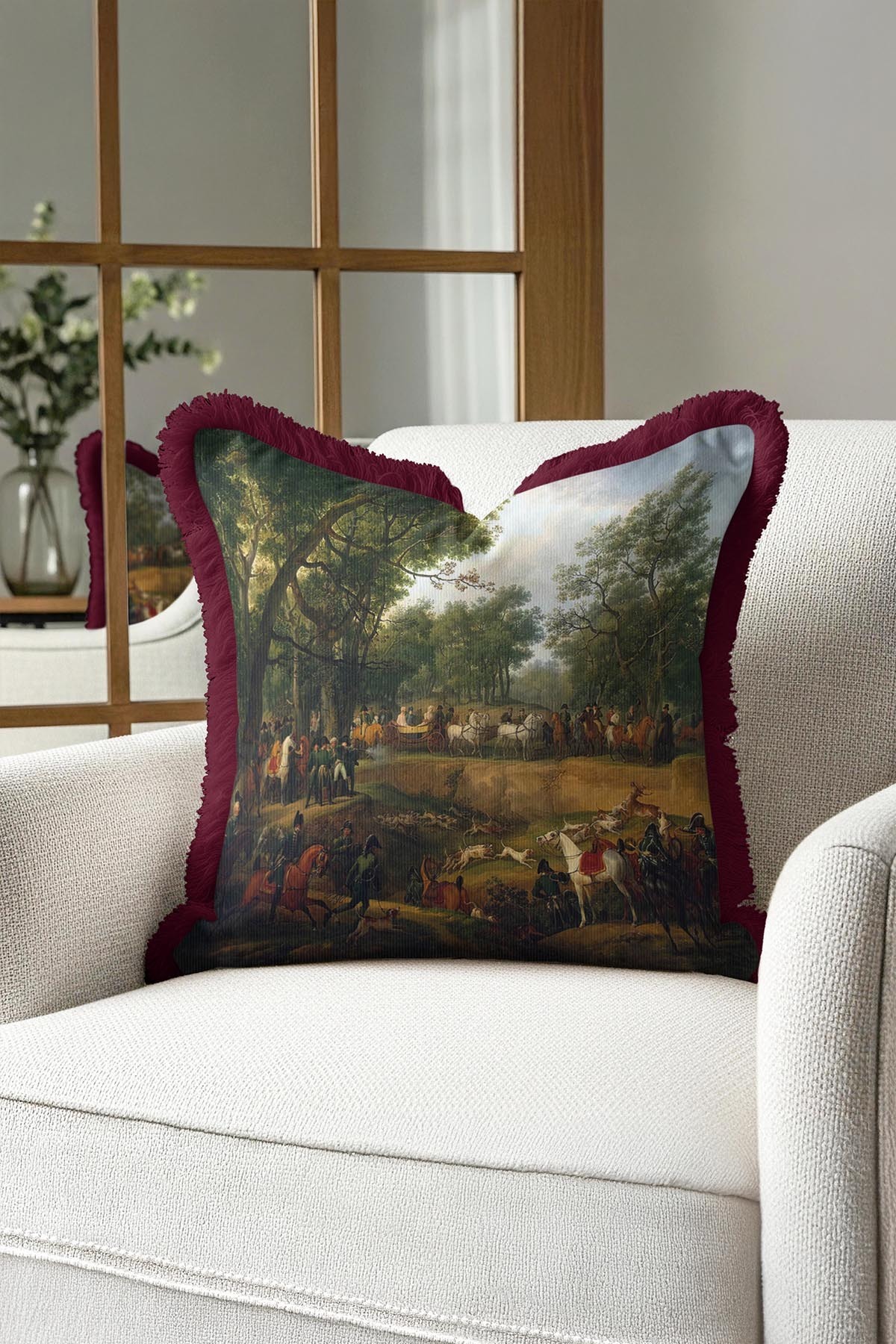 Avangard Asil Av Partisi Lüx Saçaklı Yastık Kılıfı-Atlı Aristokrat Desenli Püsküllü Kırlent Kılıfı Avangard Asil Av Partisi Lüx Saçaklı Yastık Kılıfı-Atlı Aristokrat Desenli Püsküllü Kırlent Kılıfı GRS28 40 x 40