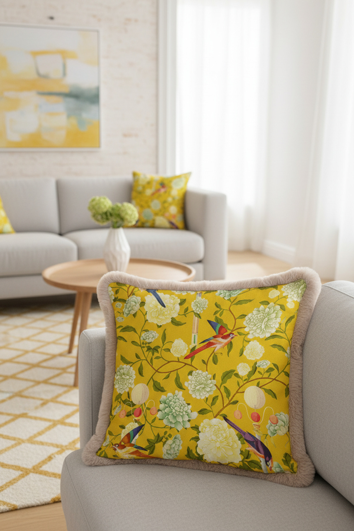 Zarif Kuşlu Çiçekli Saçaklı Yastık Kılıfı - Vintage Doğa Temalı Altın Renkli Püsküllü Kırlent Kılıfı Zarif Kuşlu Çiçekli Saçaklı Yastık Kılıfı - Vintage Doğa Temalı Altın Renkli Püsküllü Kırlent Kılıfı GRS38 40 x 40