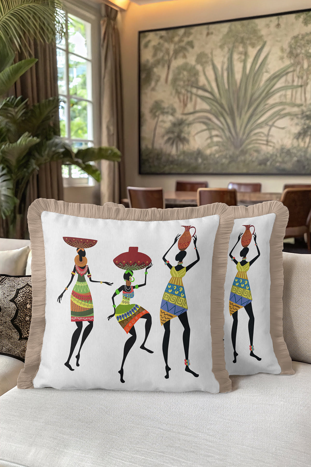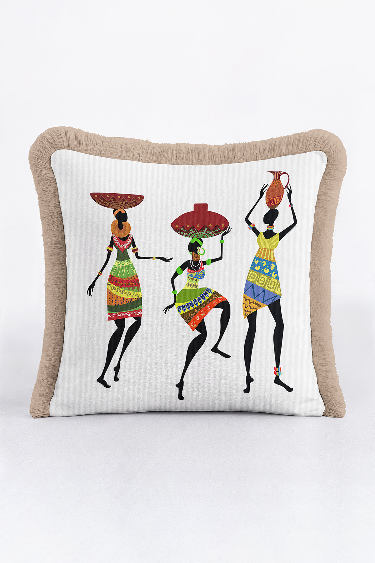 Etnik Afrika Figürlü Saçaklı Yastık Kılıfı - Enerjik Bohem Renkli Krem Püsküllü Kırlent Kılıfı Etnik Afrika Figürlü Saçaklı Yastık Kılıfı - Enerjik Bohem Renkli Krem Püsküllü Kırlent Kılıfı GRS78 40 x 40