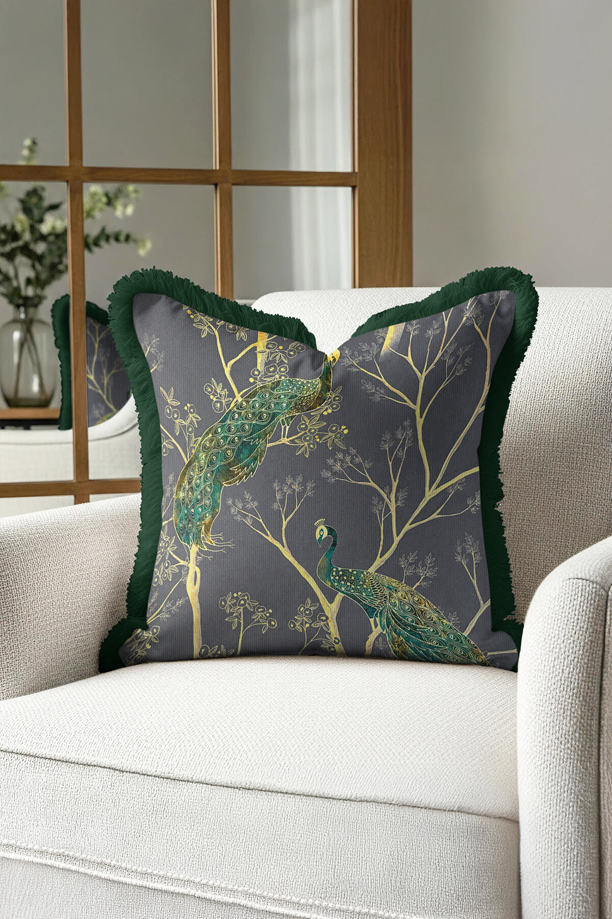 Zümrüt Zeminde Tavuskuşu Saçaklı Yastık Kılıfı-Zarif Tavuskuşu Modern Püsküllü Kırlent Kılıfı Zümrüt Zeminde Tavuskuşu Saçaklı Yastık Kılıfı-Zarif Tavuskuşu Modern Püsküllü Kırlent Kılıfı GRS18 40 x 40