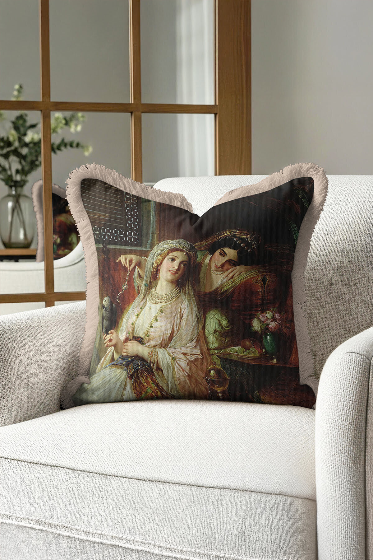 Saray Esintili Saçaklı Yastık Kılıfı - Oryantal Osmanlı Nostaljik Bej Renk Püsküllü Kırlent Kılıfı Saray Esintili Saçaklı Yastık Kılıfı - Oryantal Osmanlı Nostaljik Bej Renk Püsküllü Kırlent Kılıfı GRS53 40 x 40