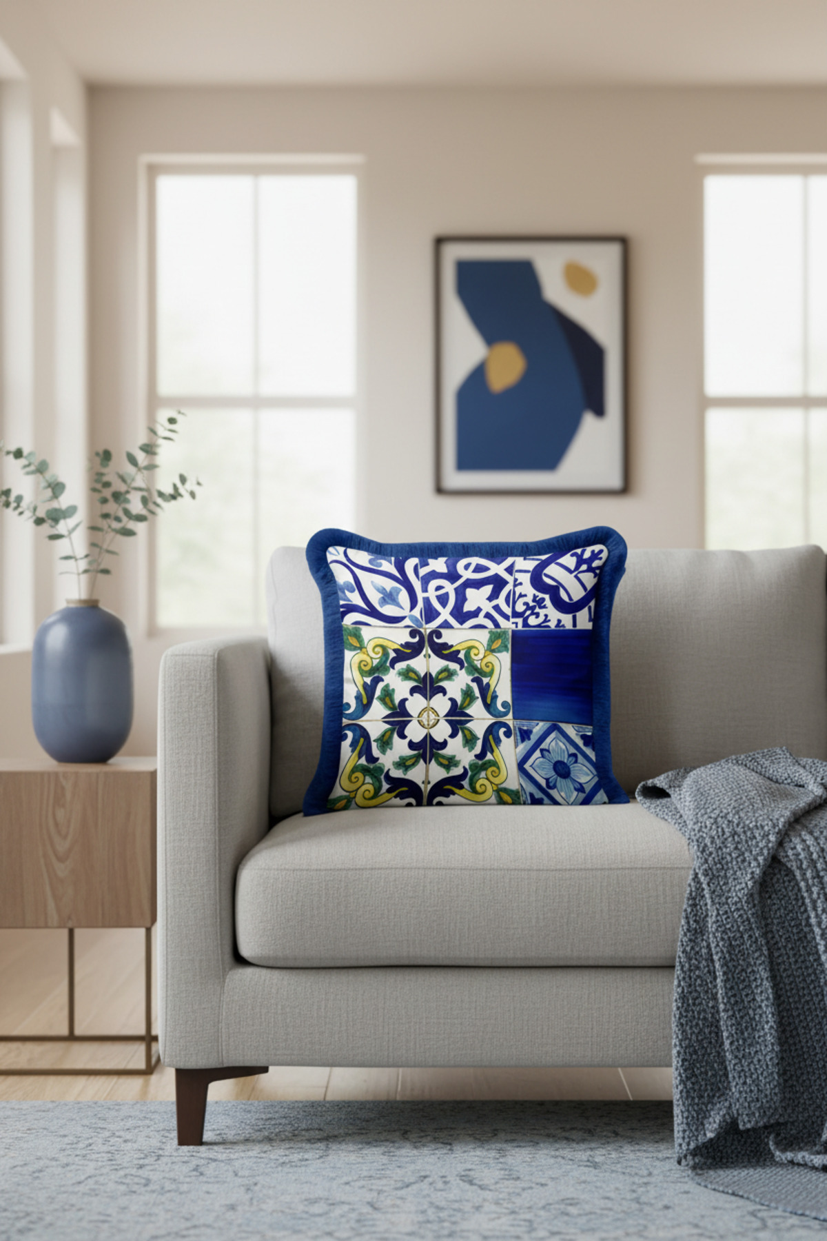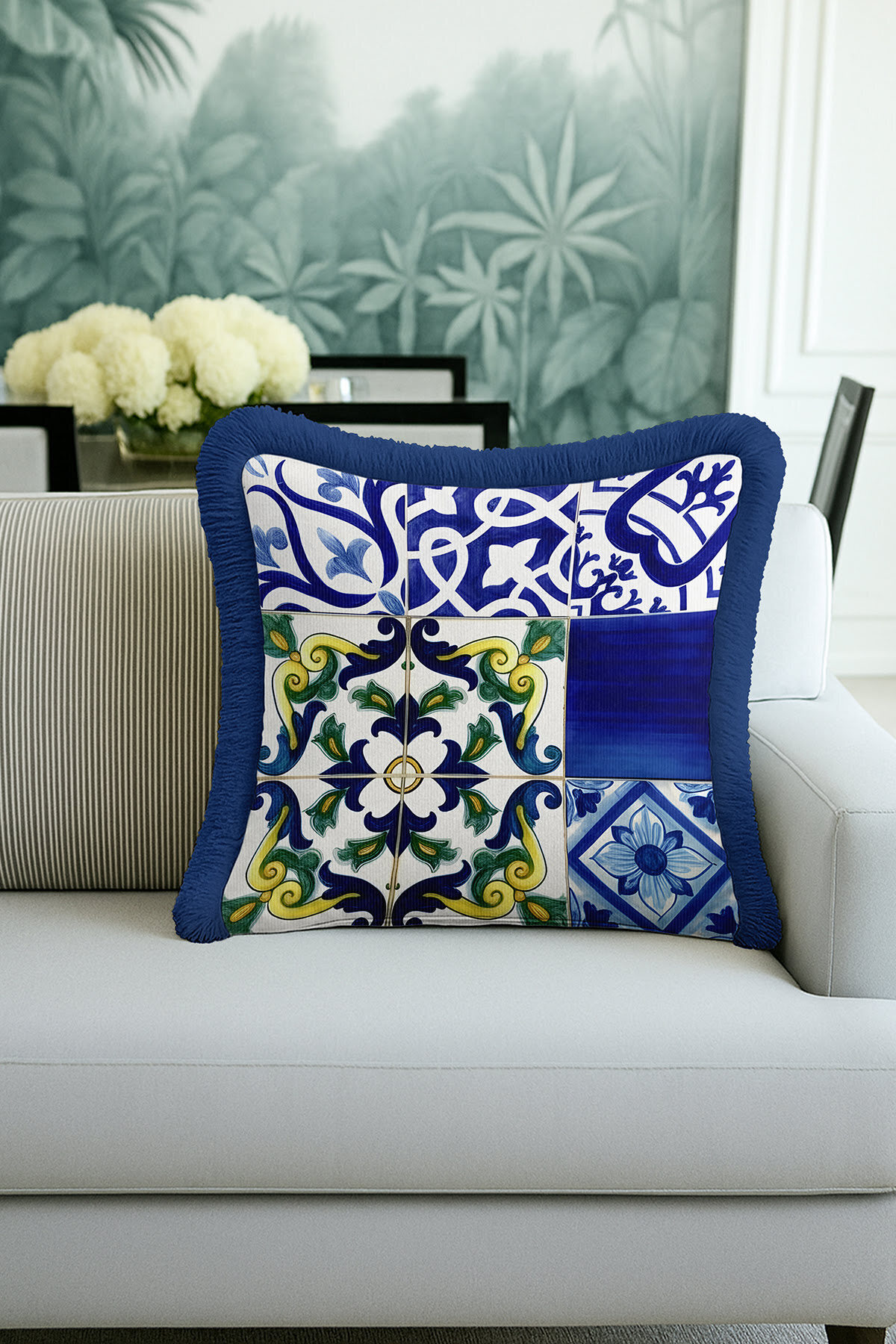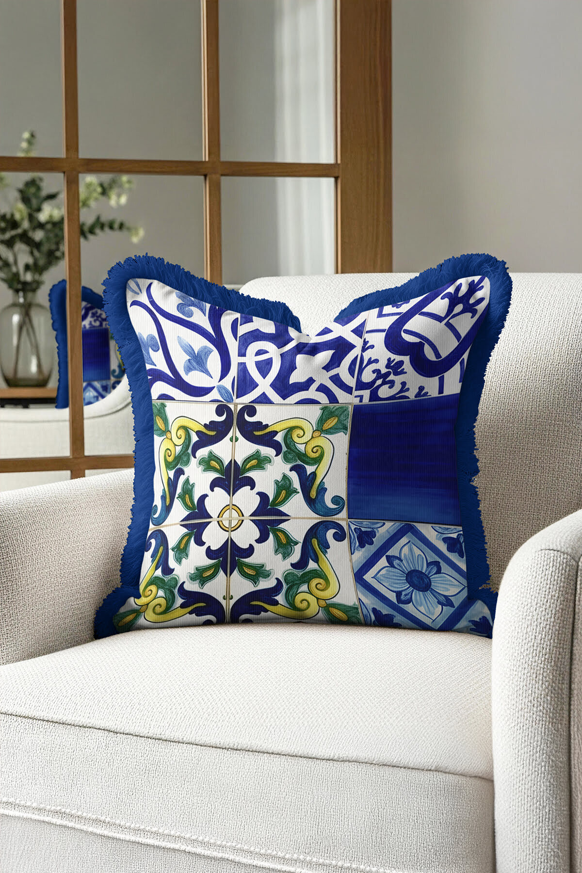 Akdeniz Motifli Saçaklı Yastık Kılıfı - Seramik Eklektik Mavi Çiçek Motifli Püsküllü Kırlent Kılıfı Akdeniz Motifli Saçaklı Yastık Kılıfı - Seramik Eklektik Mavi Çiçek Motifli Püsküllü Kırlent Kılıfı GRS45 40 x 40