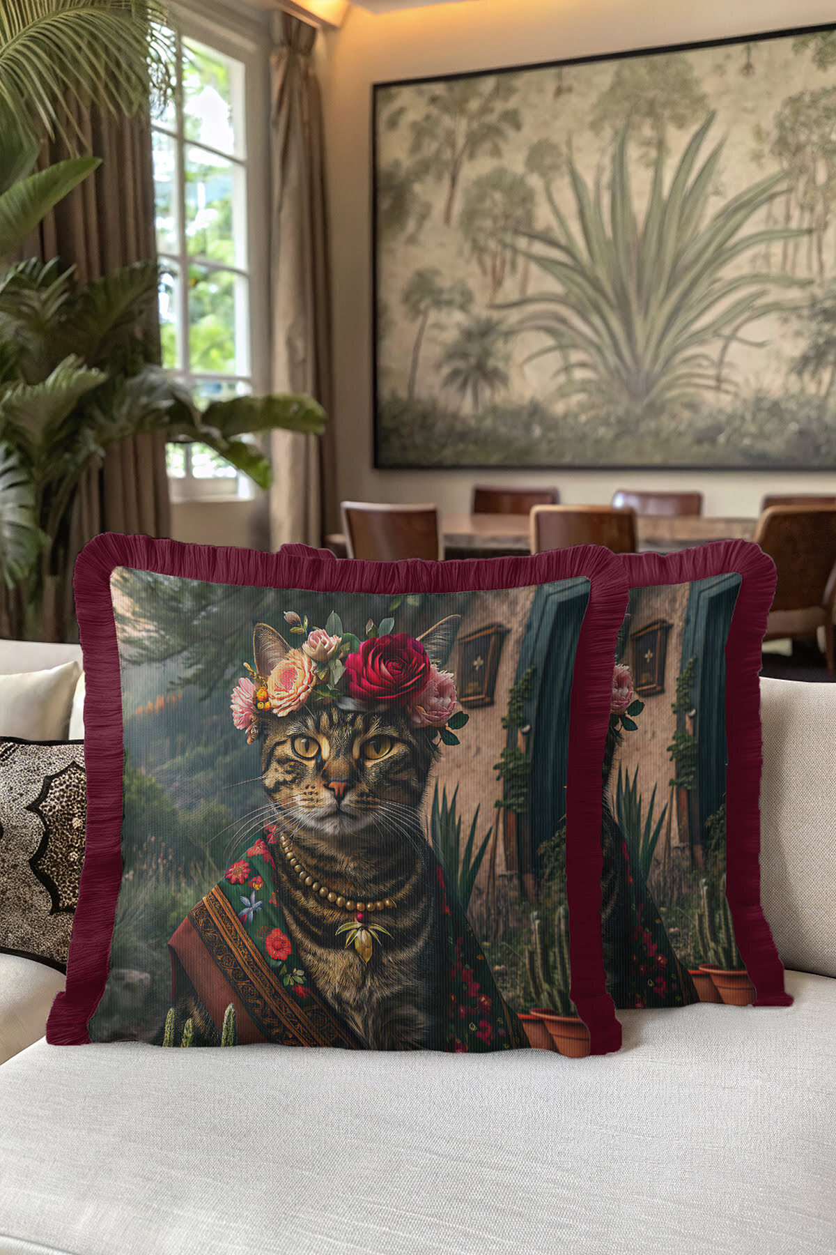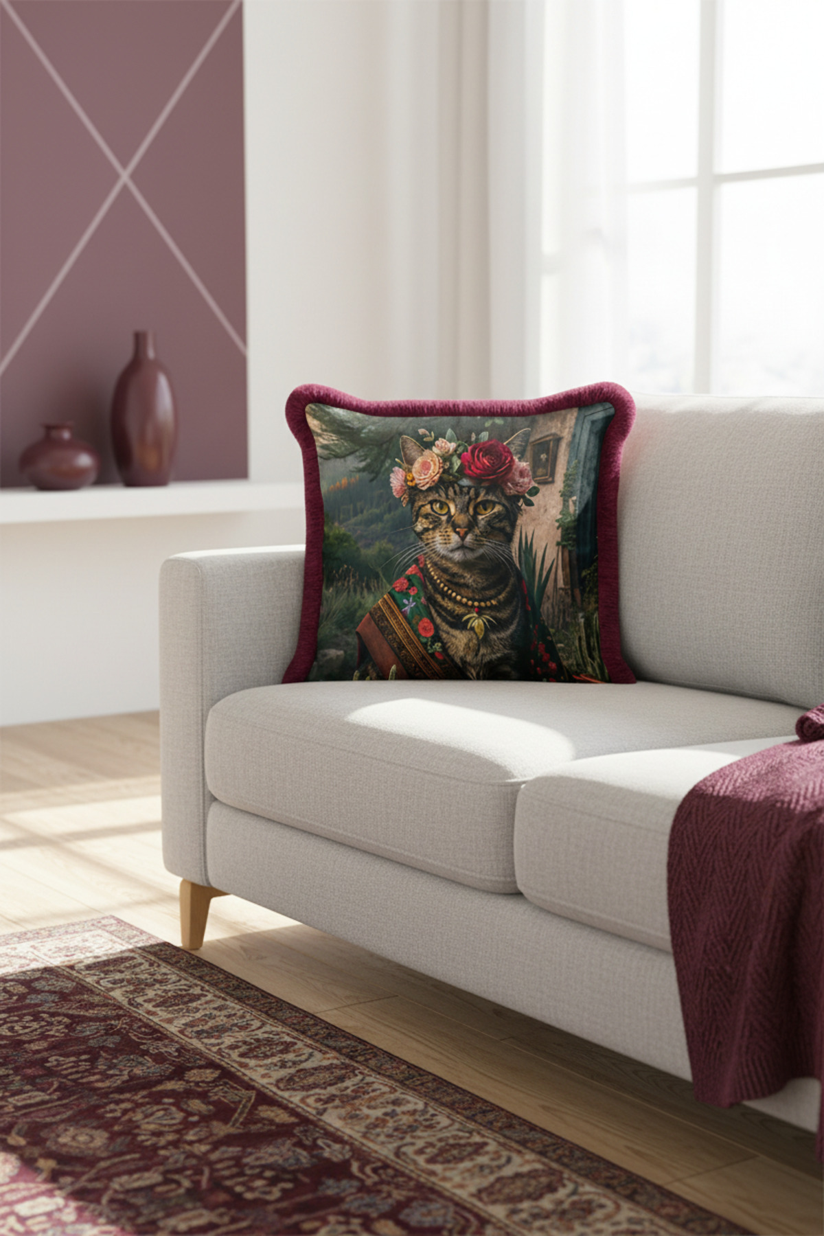 Bohem Lüks Çiçekli Saçaklı Yastık Kılıfı - Sanatsal Kedi Vintage Bordo Püsküllü Kırlent Kılıfı Bohem Lüks Çiçekli Saçaklı Yastık Kılıfı - Sanatsal Kedi Vintage Bordo Püsküllü Kırlent Kılıfı GRS29 40 x 40