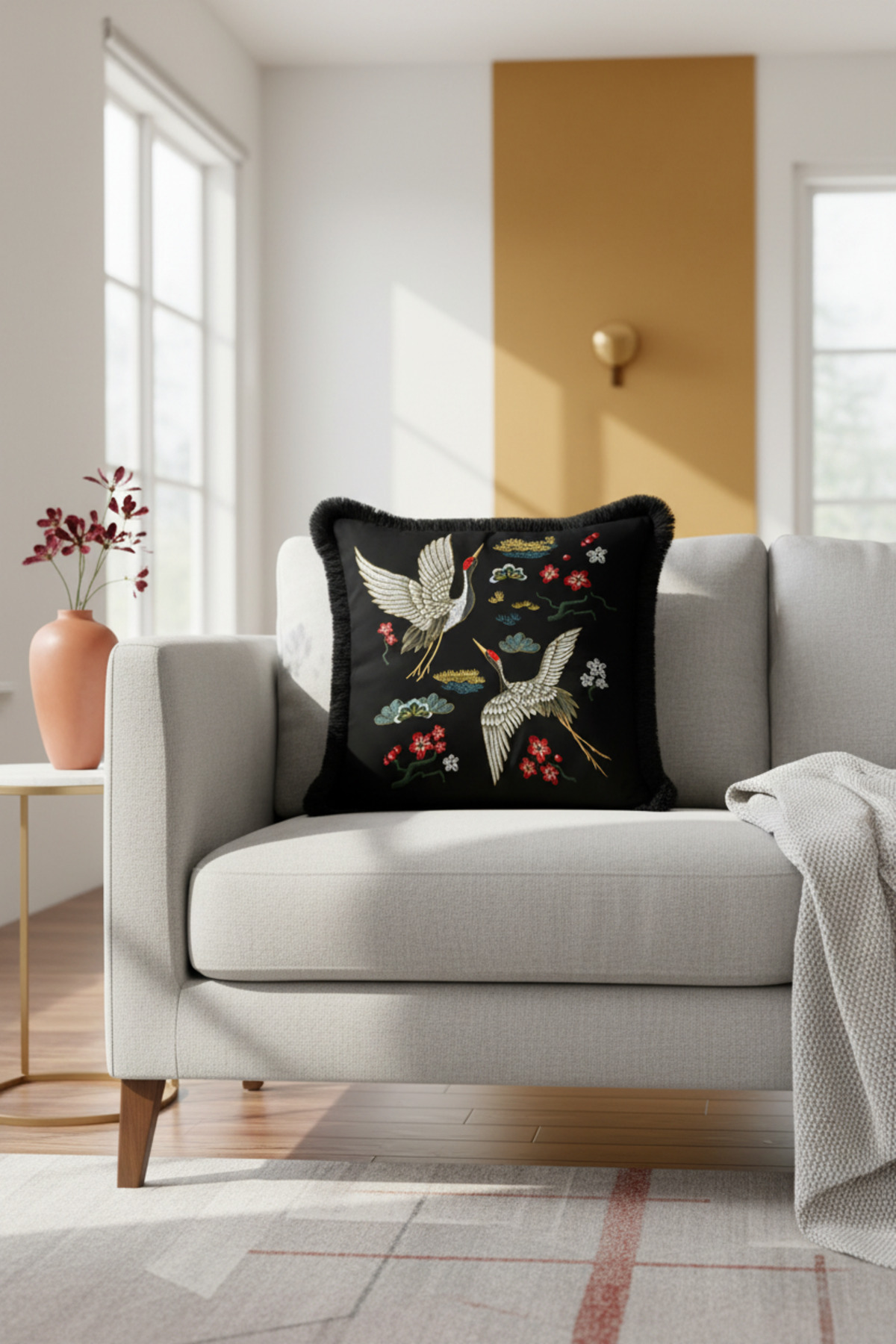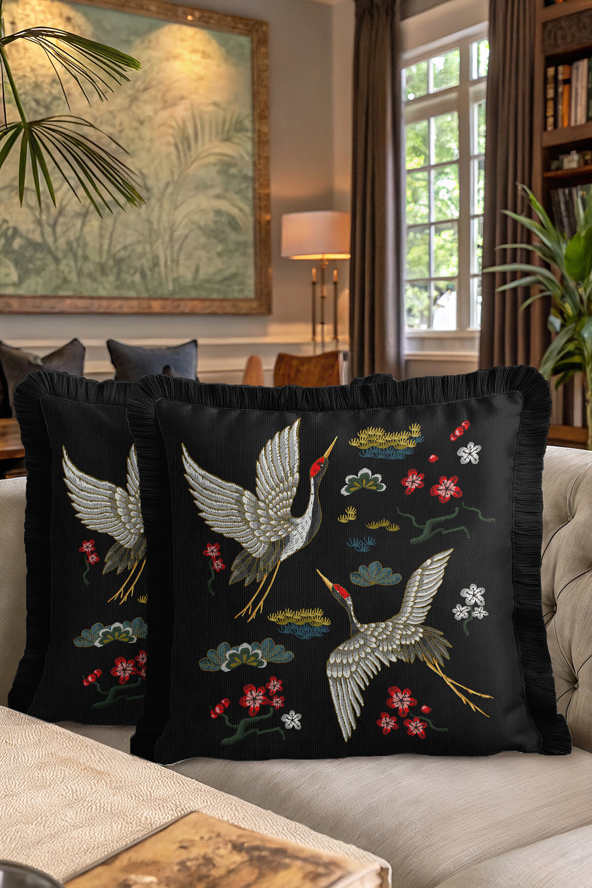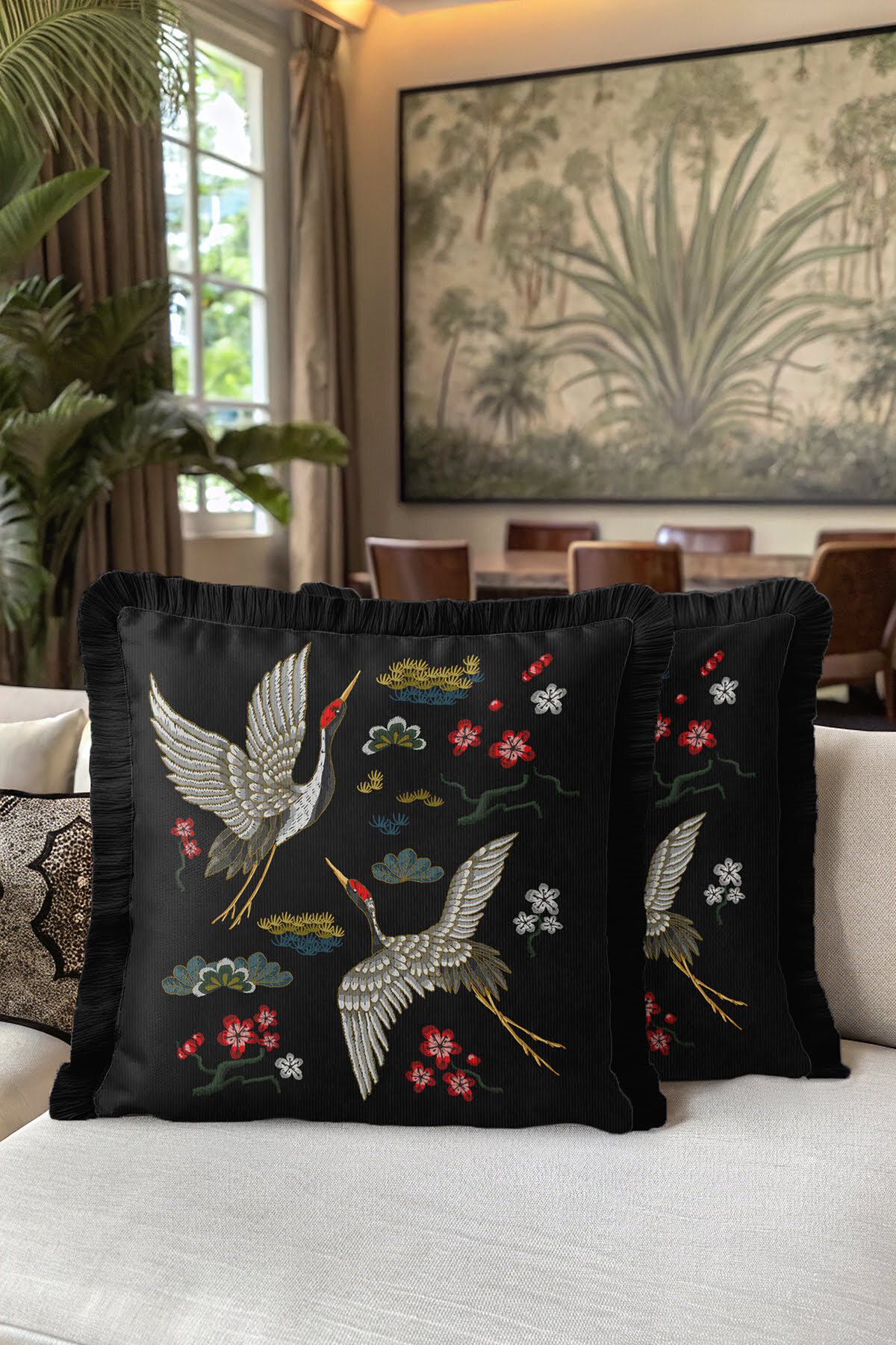 Zarif Turna Kuşu Saçaklı Yastık Kılıfı - Asya Esintili Bohem Siyah Krem Püsküllü Kırlent Kılıfı Zarif Turna Kuşu Saçaklı Yastık Kılıfı - Asya Esintili Bohem Siyah Krem Püsküllü Kırlent Kılıfı GRS30 40 x 40