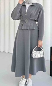 Beli Bağlamalı Fermuarlı Etekli Tesettür Takım-GRİ Beli Bağlamalı Fermuarlı Etekli Tesettür Takım-GRİ 8408 42