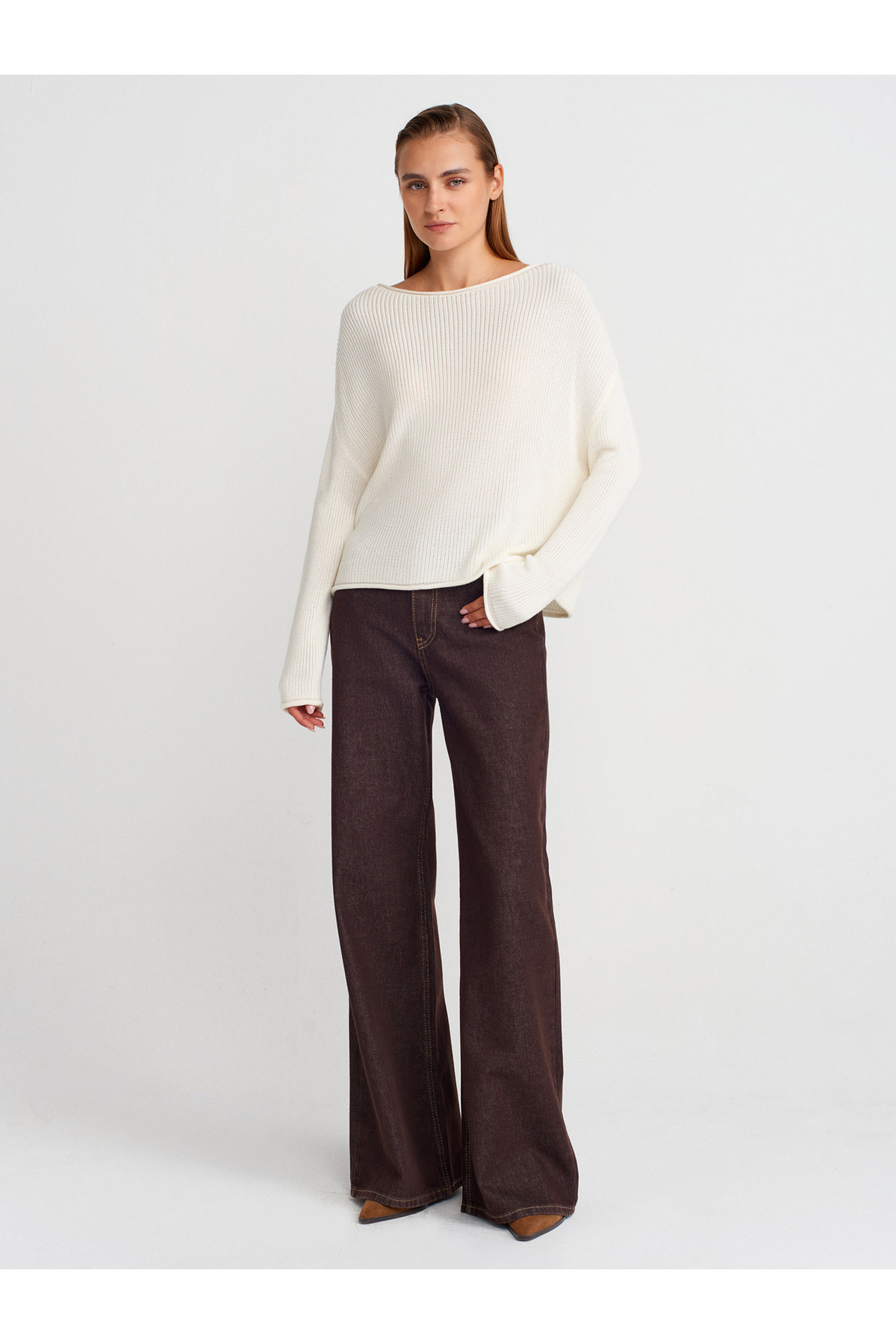 10804 Kayık Yaka Dökümlü Triko Kazak-Ekru 10804 Kayık Yaka Dökümlü Triko Kazak-Ekru Standart