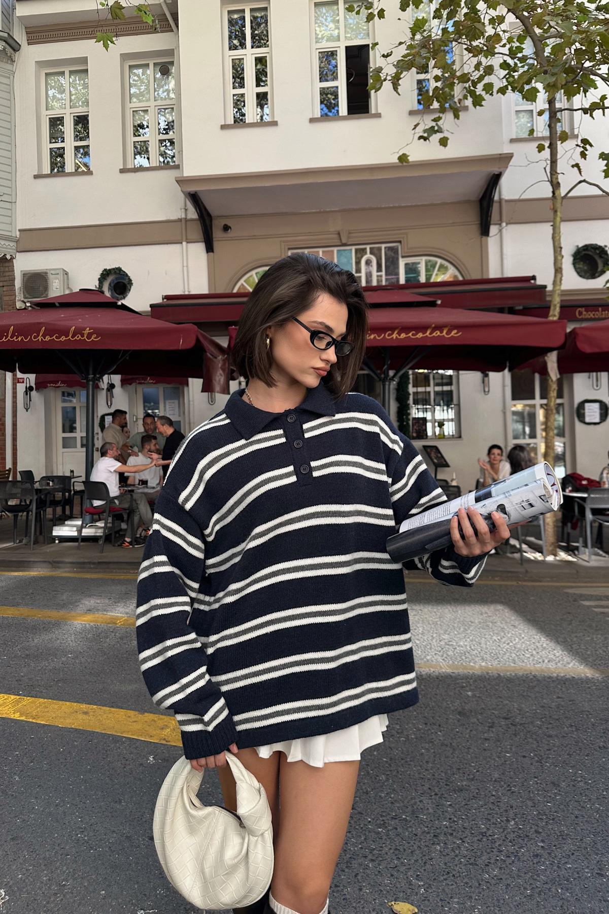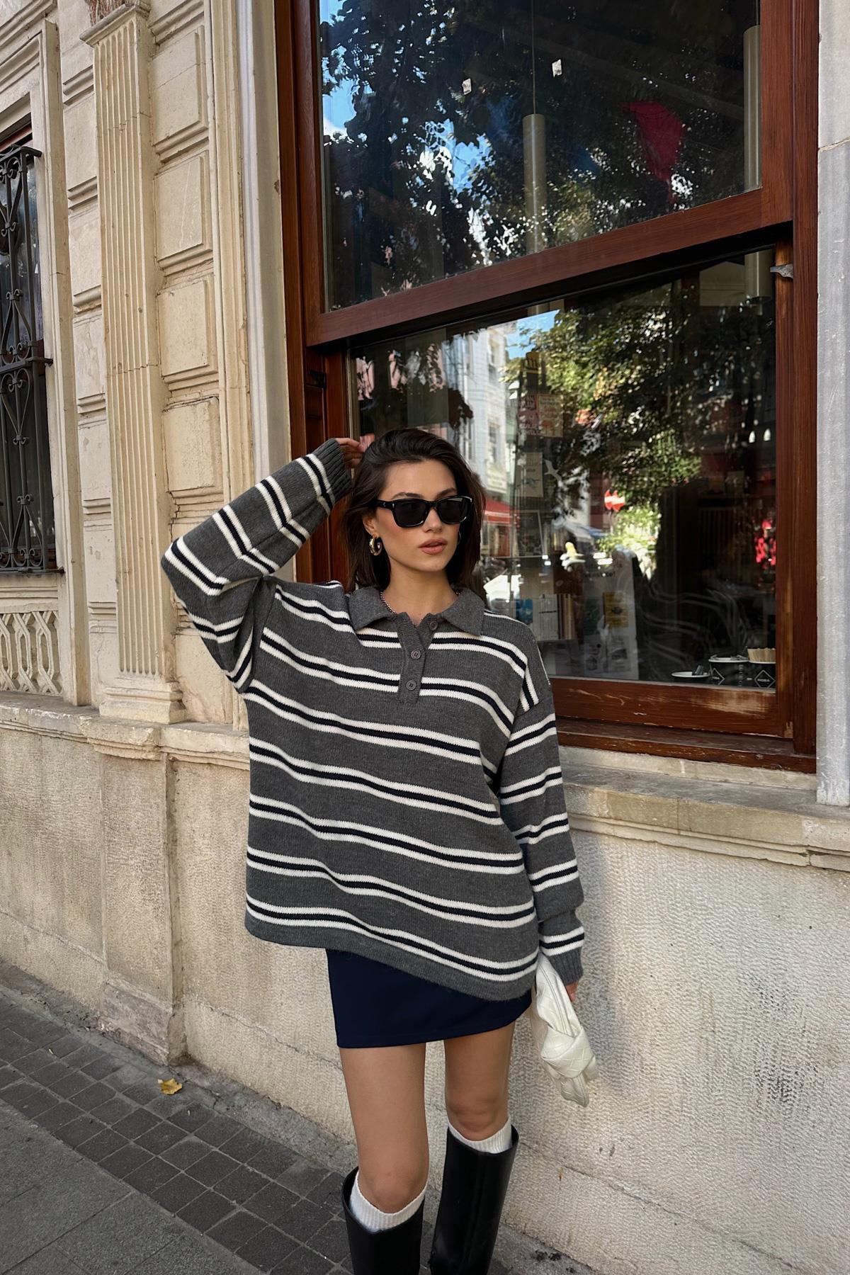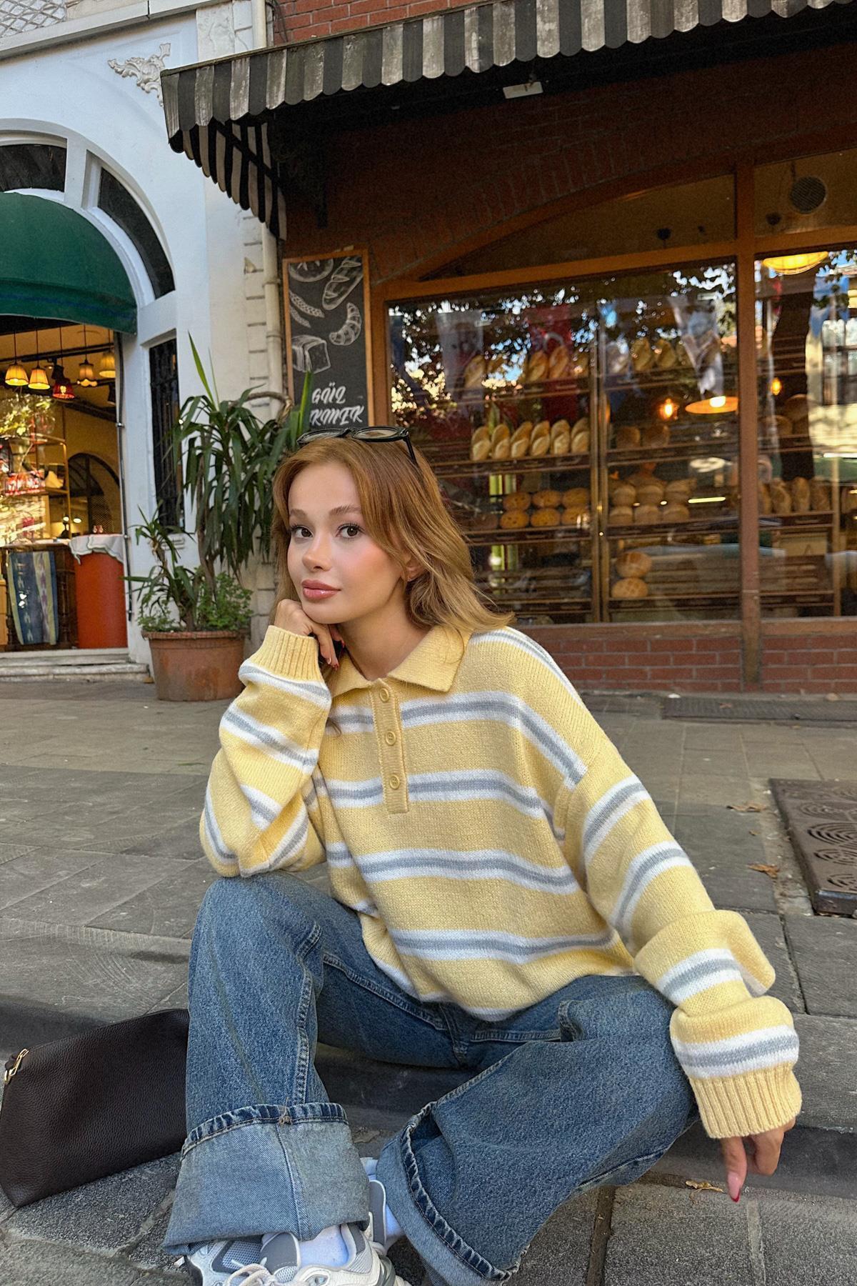 Çizgili Polo Yaka Yün Kazak Sarı Çizgili Polo Yaka Yün Kazak Sarı TX9AD2483639407 L