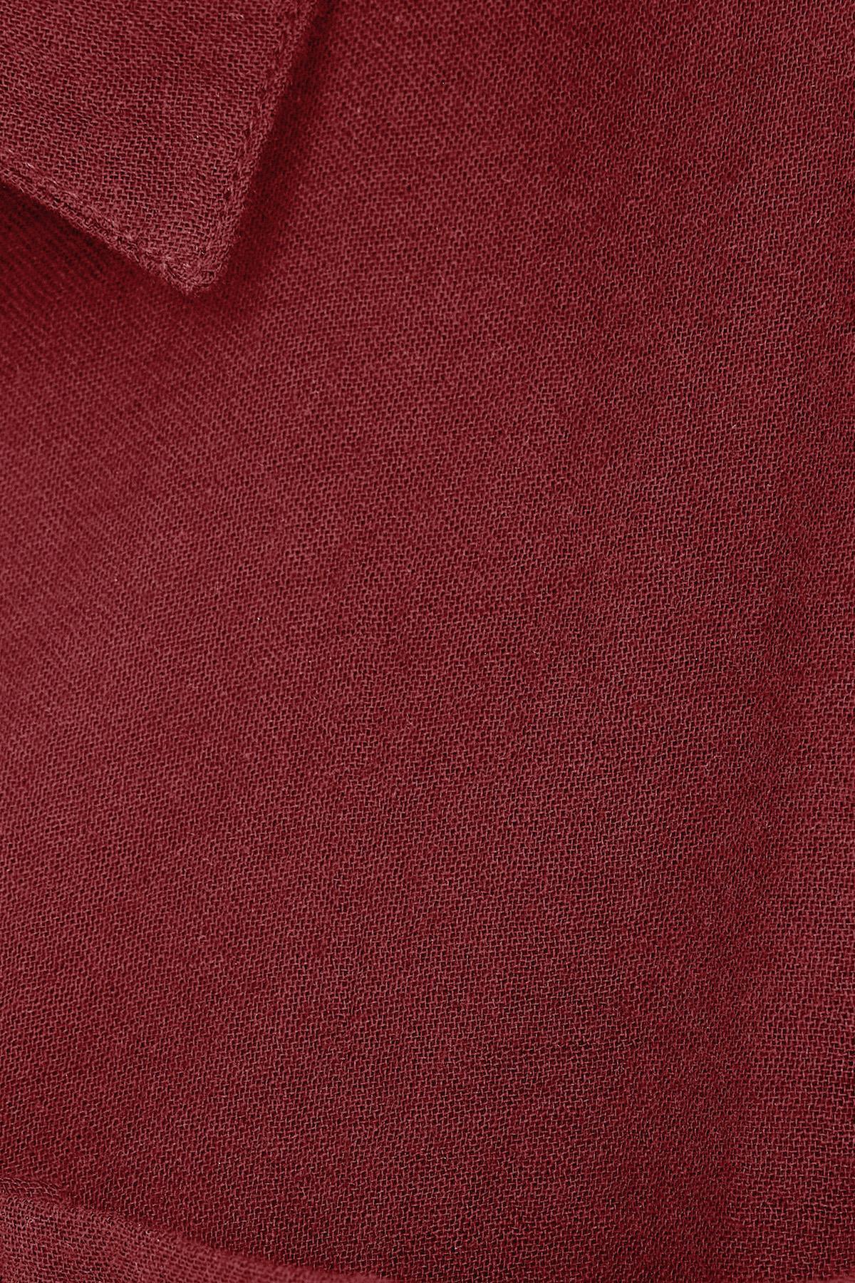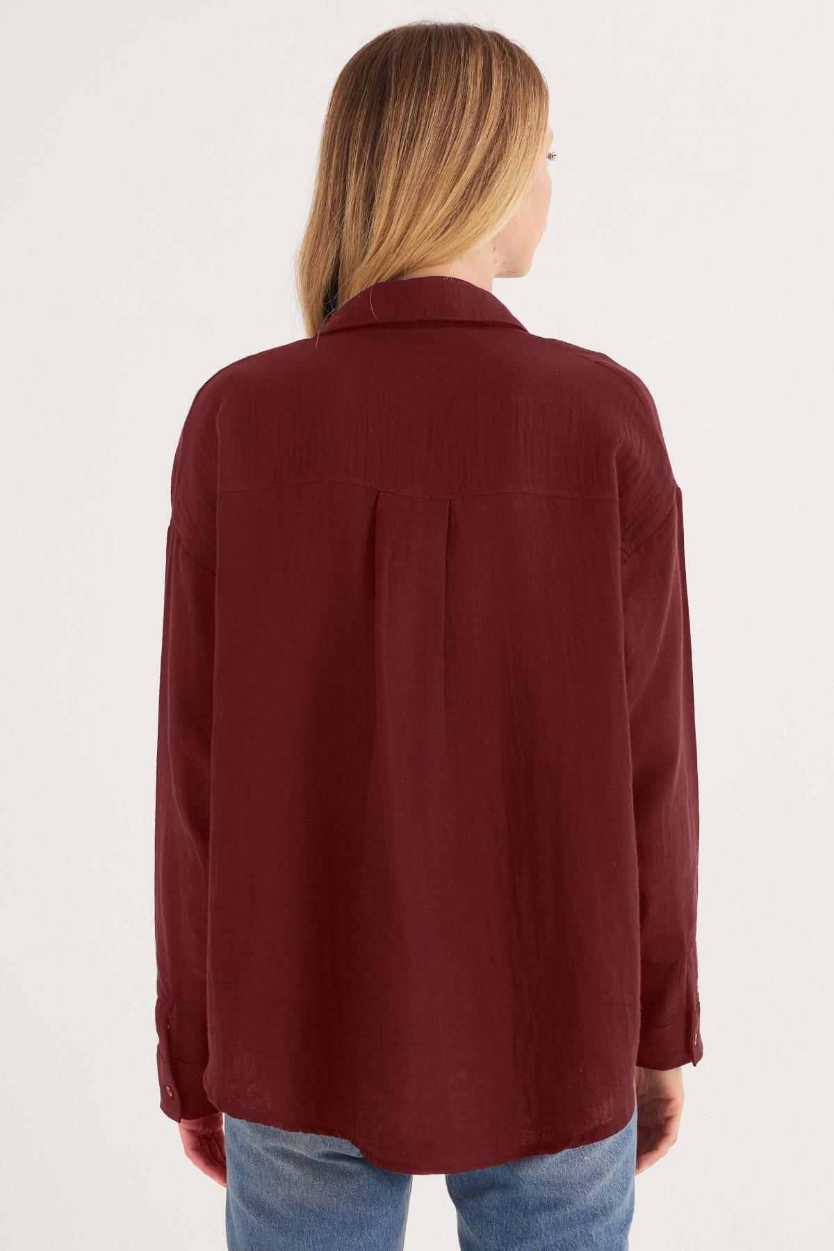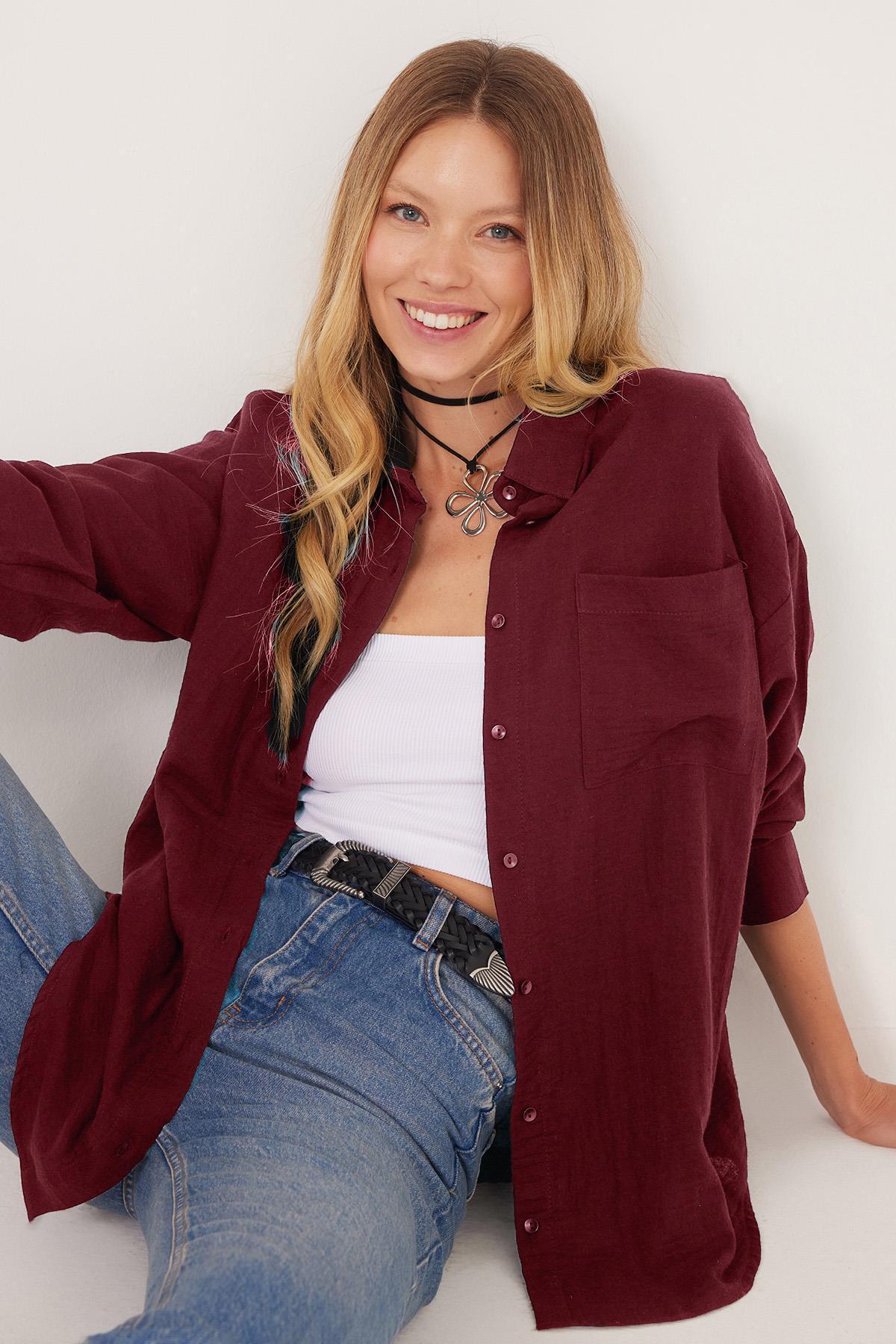 Kadın Oversize Geniş Kesim %100 Pamuk Müslin Kumaş Uzun Kollu Cepli Dokulu Bordo Gömlek Kadın Oversize Geniş Kesim %100 Pamuk Müslin Kumaş Uzun Kollu Cepli Dokulu Bordo Gömlek BYGM2551 L