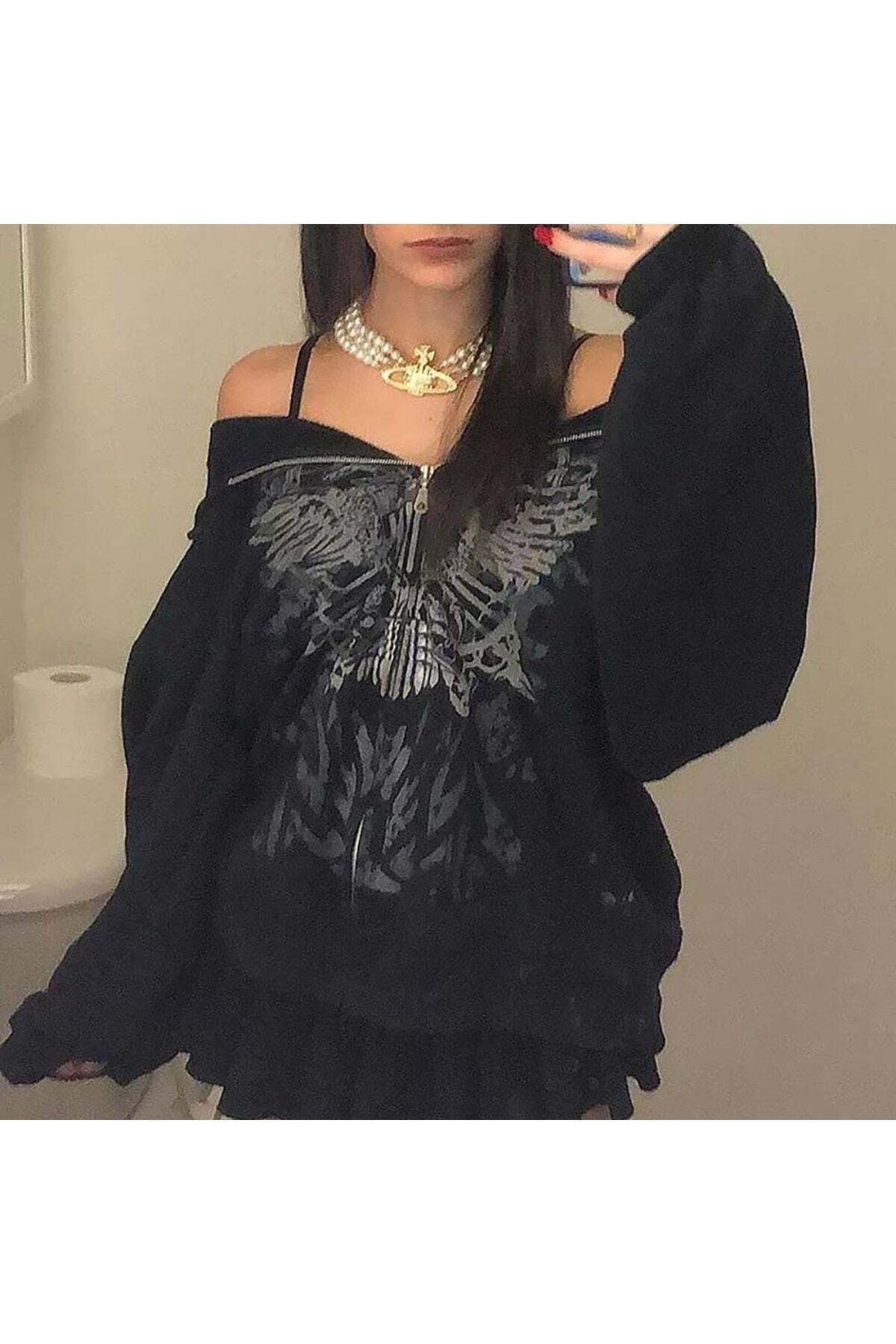 Yıkamalı Gothic Butterfly Baskılı Vintage Kapüşonlu Sweatshirt Yıkamalı Gothic Butterfly Baskılı Vintage Kapüşonlu Sweatshirt TZ9179 XL