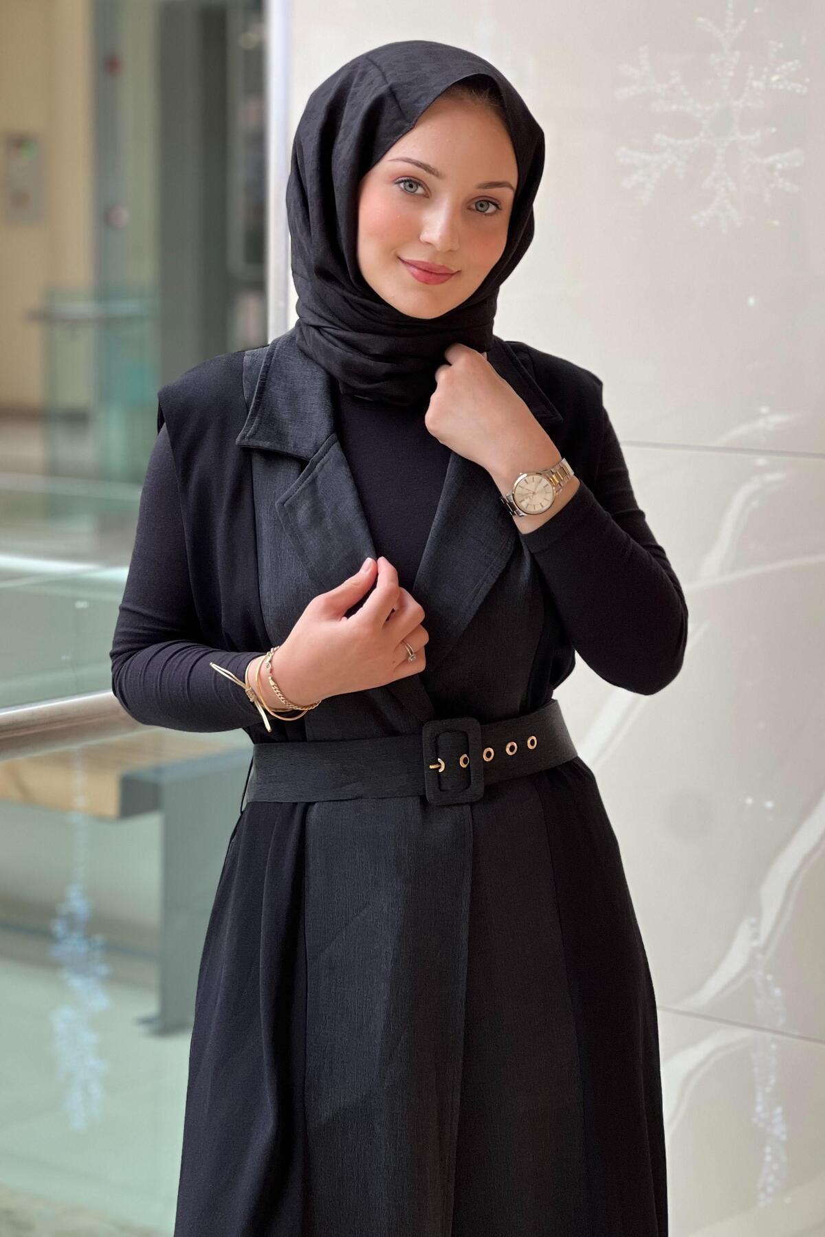 Tığ Triko Kumaş Garnili Kemerli Uzun Triko Yelek Tığ Triko Kumaş Garnili Kemerli Uzun Triko Yelek 26KTIĞYLK21869 3