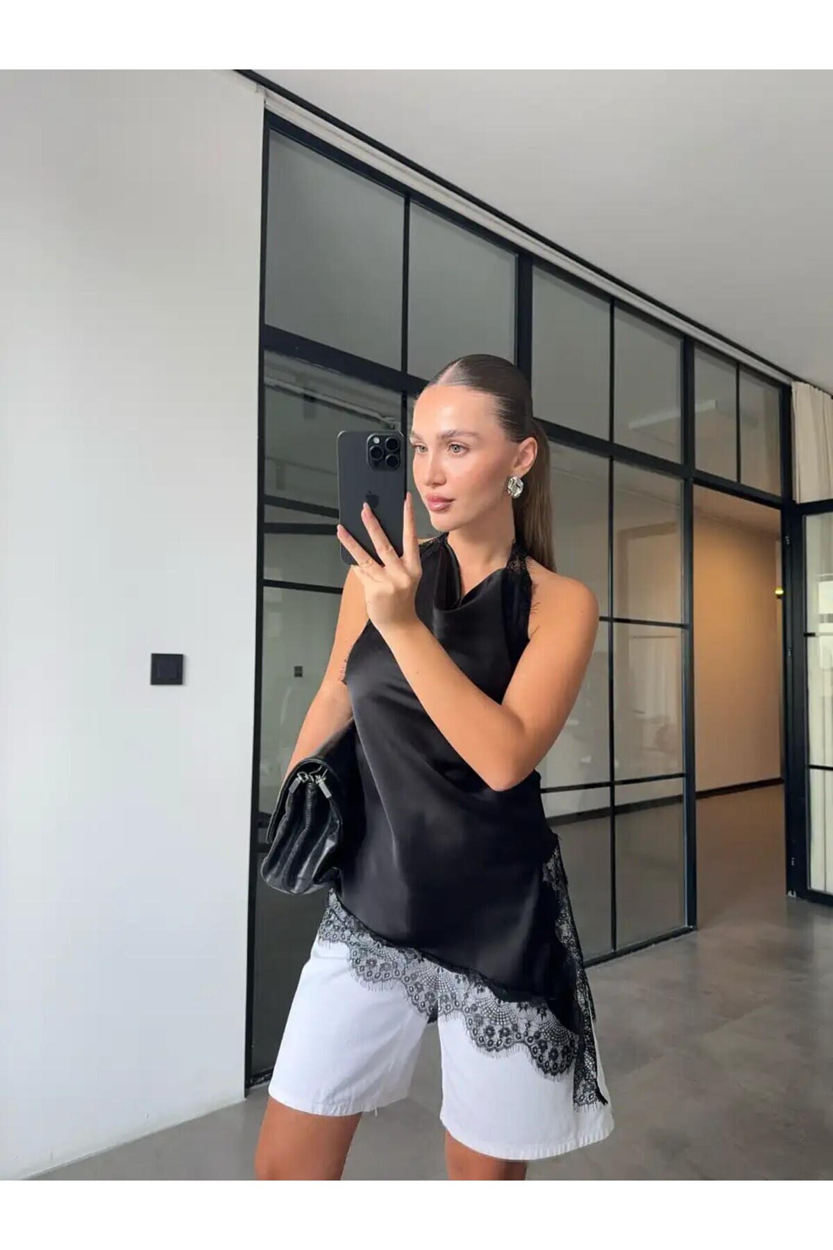 DANTEL İŞLEMELİ YIRTMAÇLI SATEN BLUZ DANTEL İŞLEMELİ YIRTMAÇLI SATEN BLUZ BB26HF8222S L