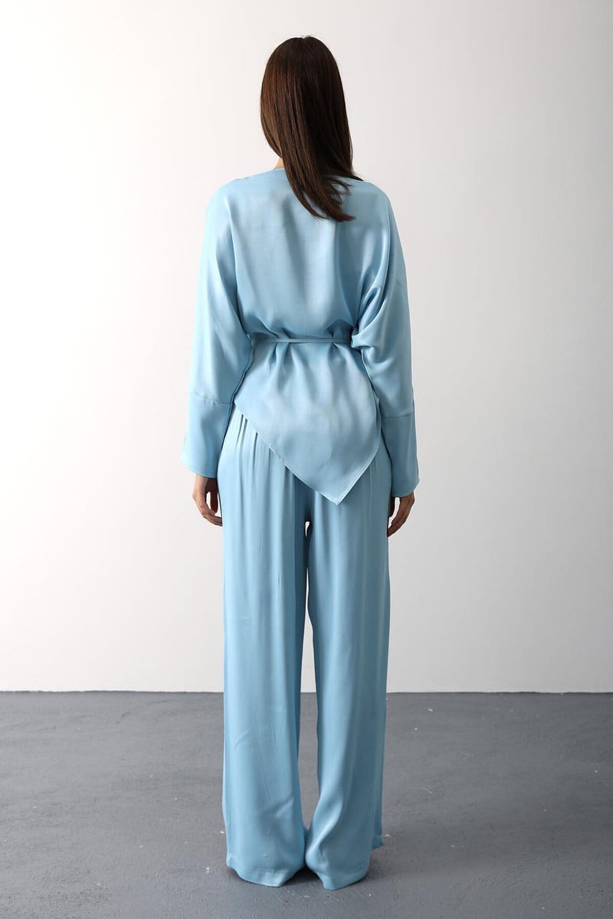 ALAÇATI STİLİ Gül Broşlu Beli Bağlamalı Asimetrik Kesim Bluz ve Beli Lastikli Pantolon Saten Takım ALAÇATI STİLİ Gül Broşlu Beli Bağlamalı Asimetrik Kesim Bluz ve Beli Lastikli Pantolon Saten Takım VS01139 L