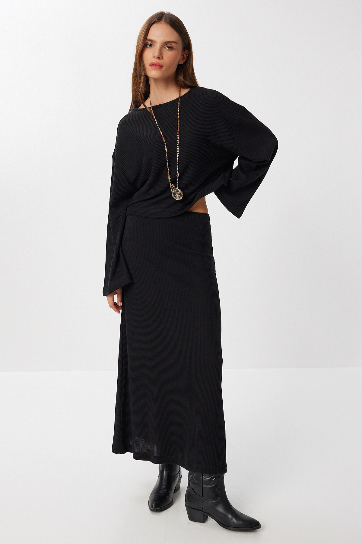 Fitilli Örme Bluz-Etek Takım LRG0044 SİYAH Fitilli Örme Bluz-Etek Takım LRG0044 SİYAH 40