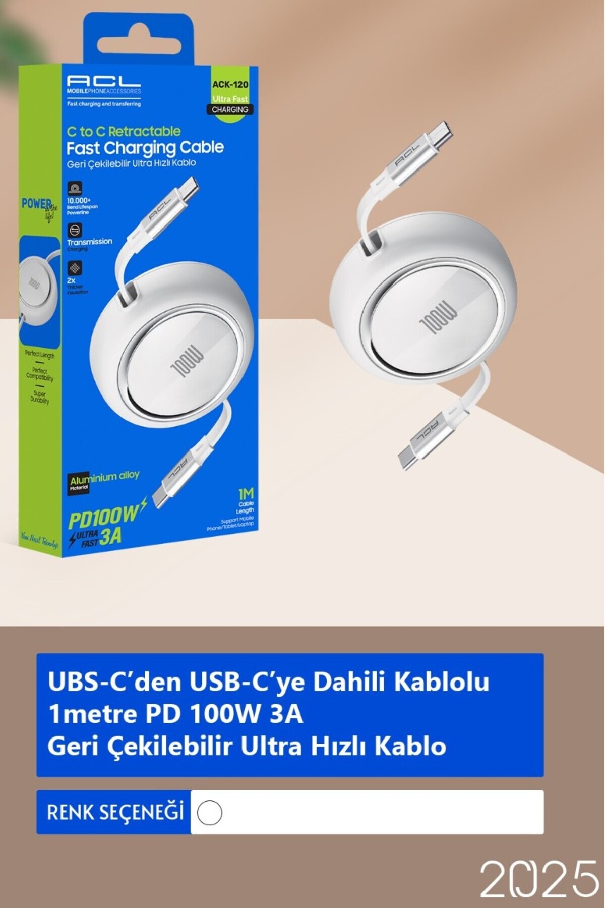 ACK-120 - 1 metre Uzunluğunda PD 100W 3A Geri Çekilebilir Ultra Hızlı Şarj Kablosu ACK-120 - 1 metre Uzunluğunda PD 100W 3A Geri Çekilebilir Ultra Hızlı Şarj Kablosu ACL ACK-120 تک سایز
