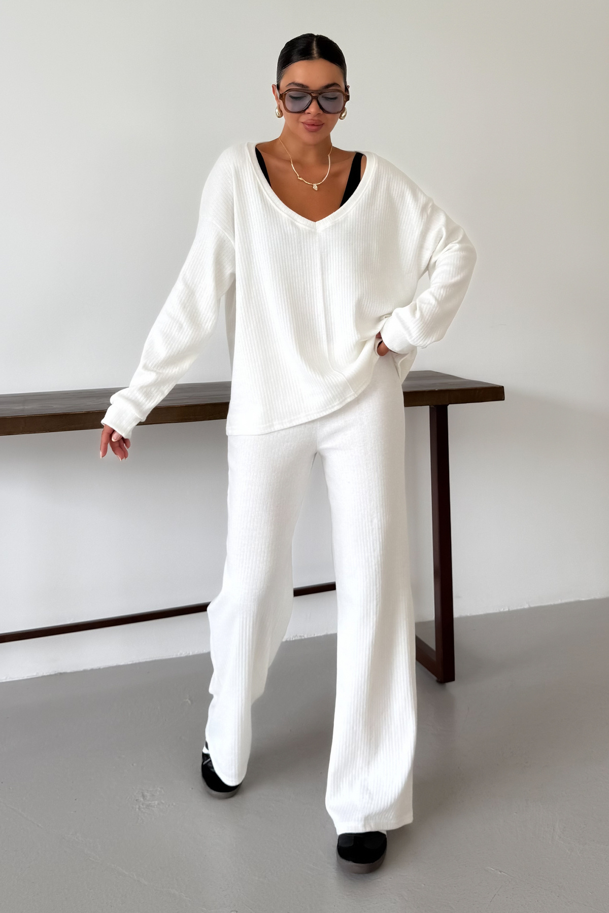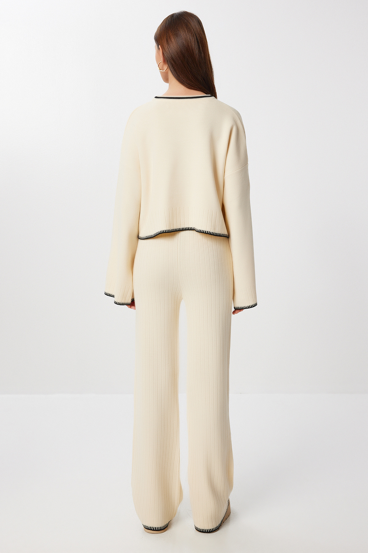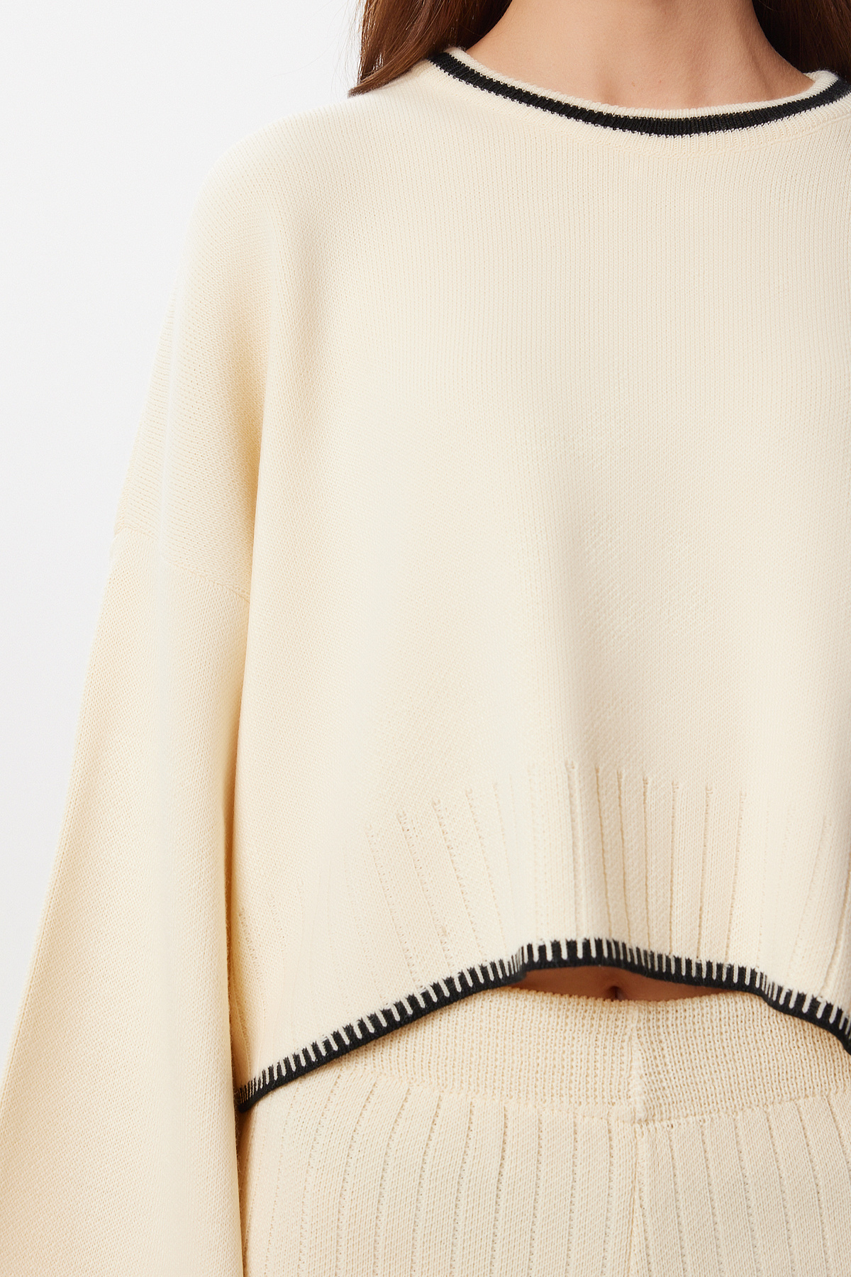 Kontrast Şeritli Kazak Pantolon Takım LİY0003 KREM Kontrast Şeritli Kazak Pantolon Takım LİY0003 KREM تک سایز