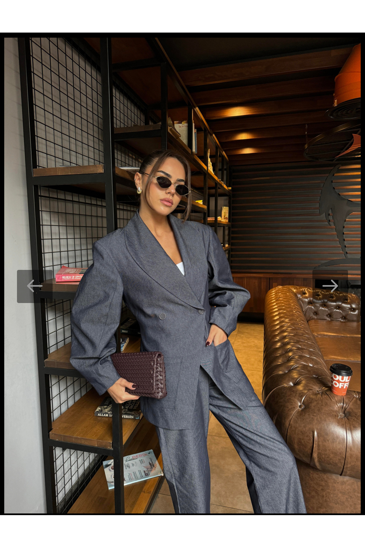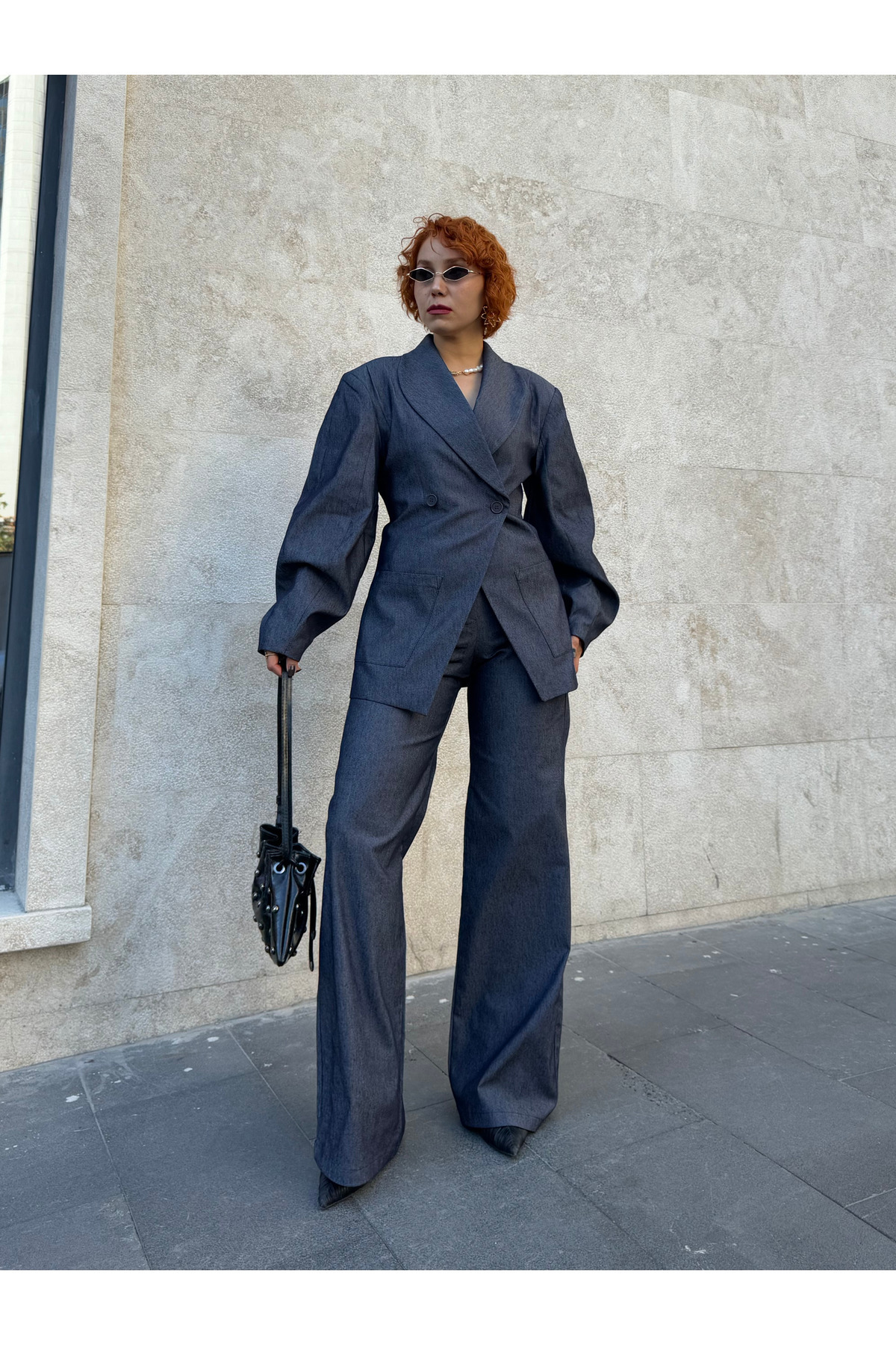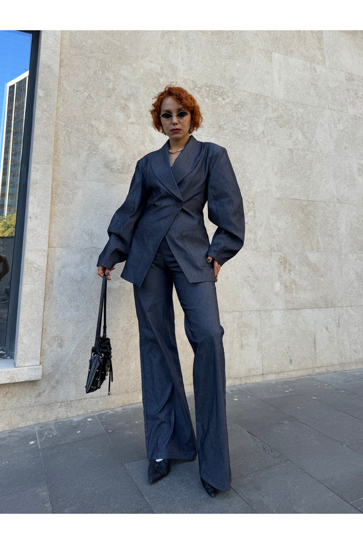 Premium Tasarım Belden Oturtmalı Balon Kol Vatkalı Ceket -Kot Palazzo Pantolon 2'li Takım Premium Tasarım Belden Oturtmalı Balon Kol Vatkalı Ceket -Kot Palazzo Pantolon 2'li Takım BAKAP BALON KOL TASARIM TAKIM L