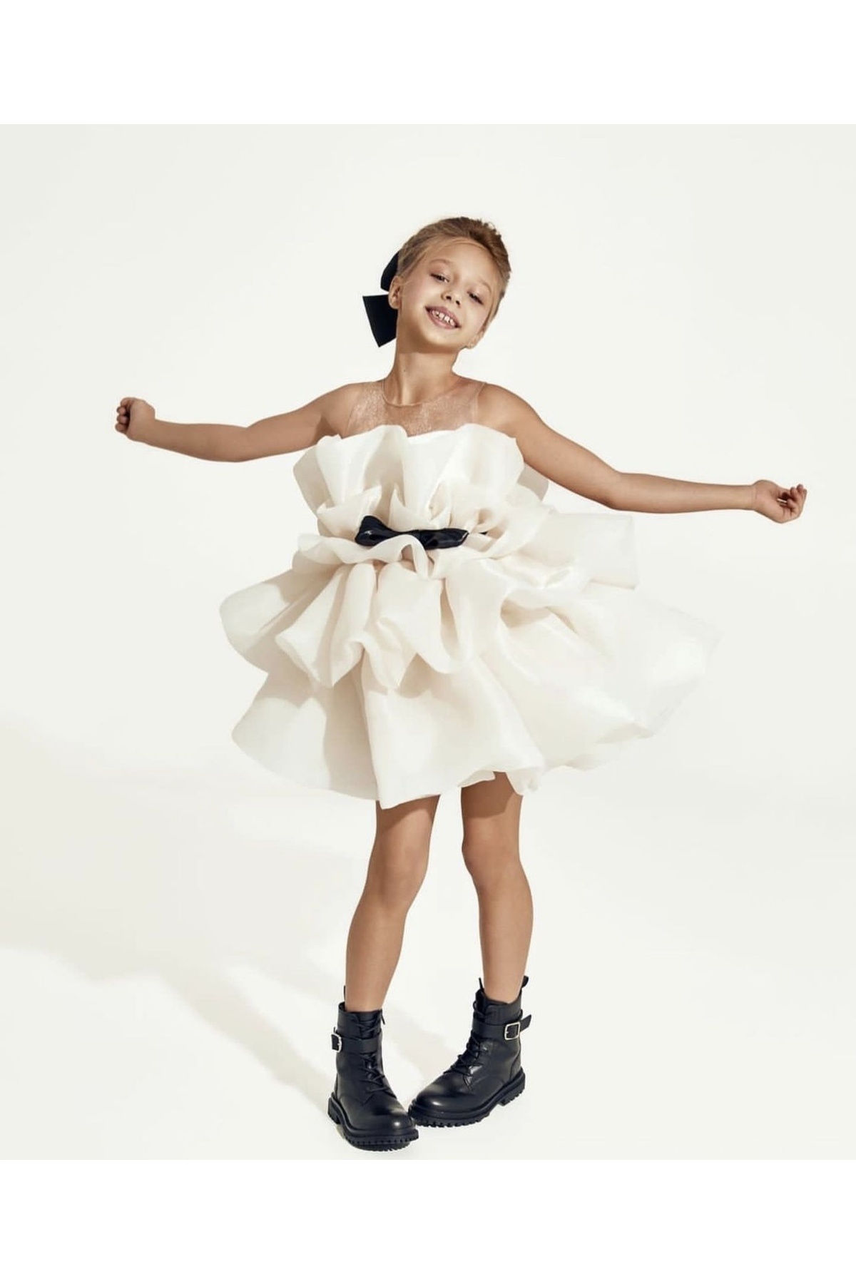Kız Çocuk Ekru Renk Tek Omuz Gül Detaylı Elbise Kız Çocuk Ekru Renk Tek Omuz Gül Detaylı Elbise GG7402 13-14 Yaş