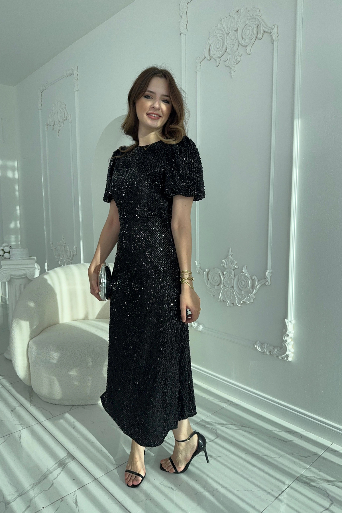 Işıltılı Vatkalı Pul Payet Siyah Elbise Işıltılı Vatkalı Pul Payet Siyah Elbise 8546 XL