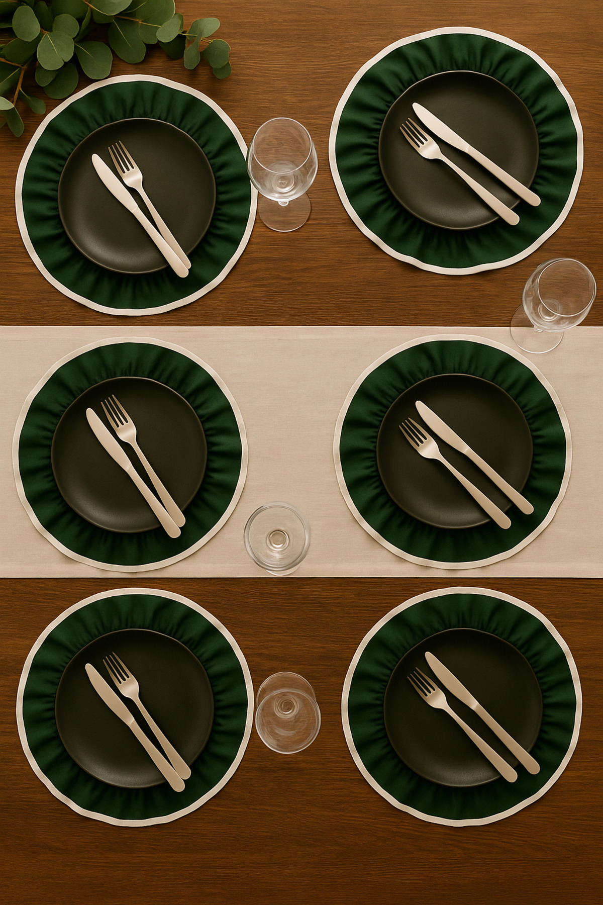 6'lı Yuvarlak Keten Amerikan Servis Seti – Yeşil, Beyaz Biyeli Fırfır Kenar Tasarım 6'lı Yuvarlak Keten Amerikan Servis Seti – Yeşil, Beyaz Biyeli Fırfır Kenar Tasarım T090498TKSL226 تک سایز