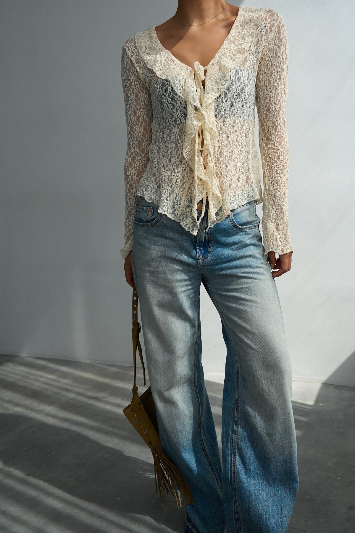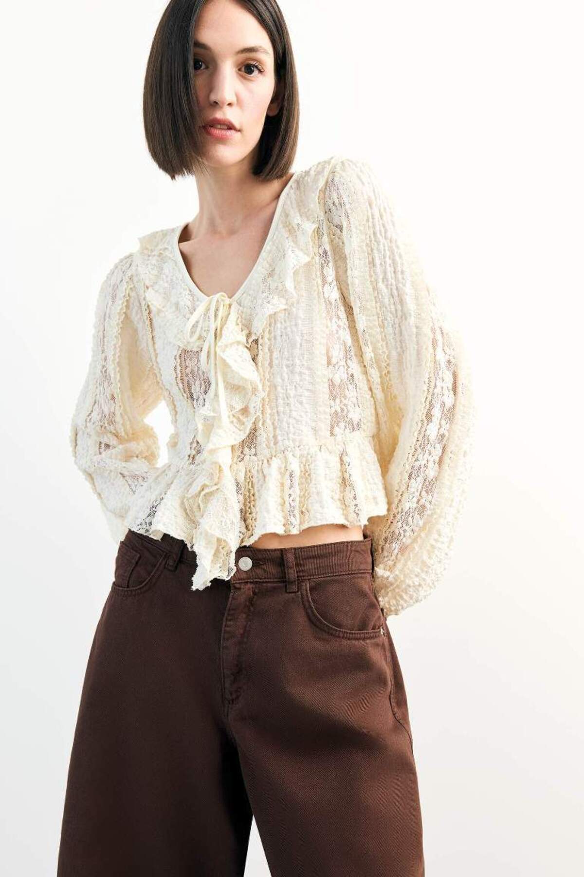 Kadın Krem Volanlı Bağlama Detaylı Dantel Bluz Kadın Krem Volanlı Bağlama Detaylı Dantel Bluz TH125454 L