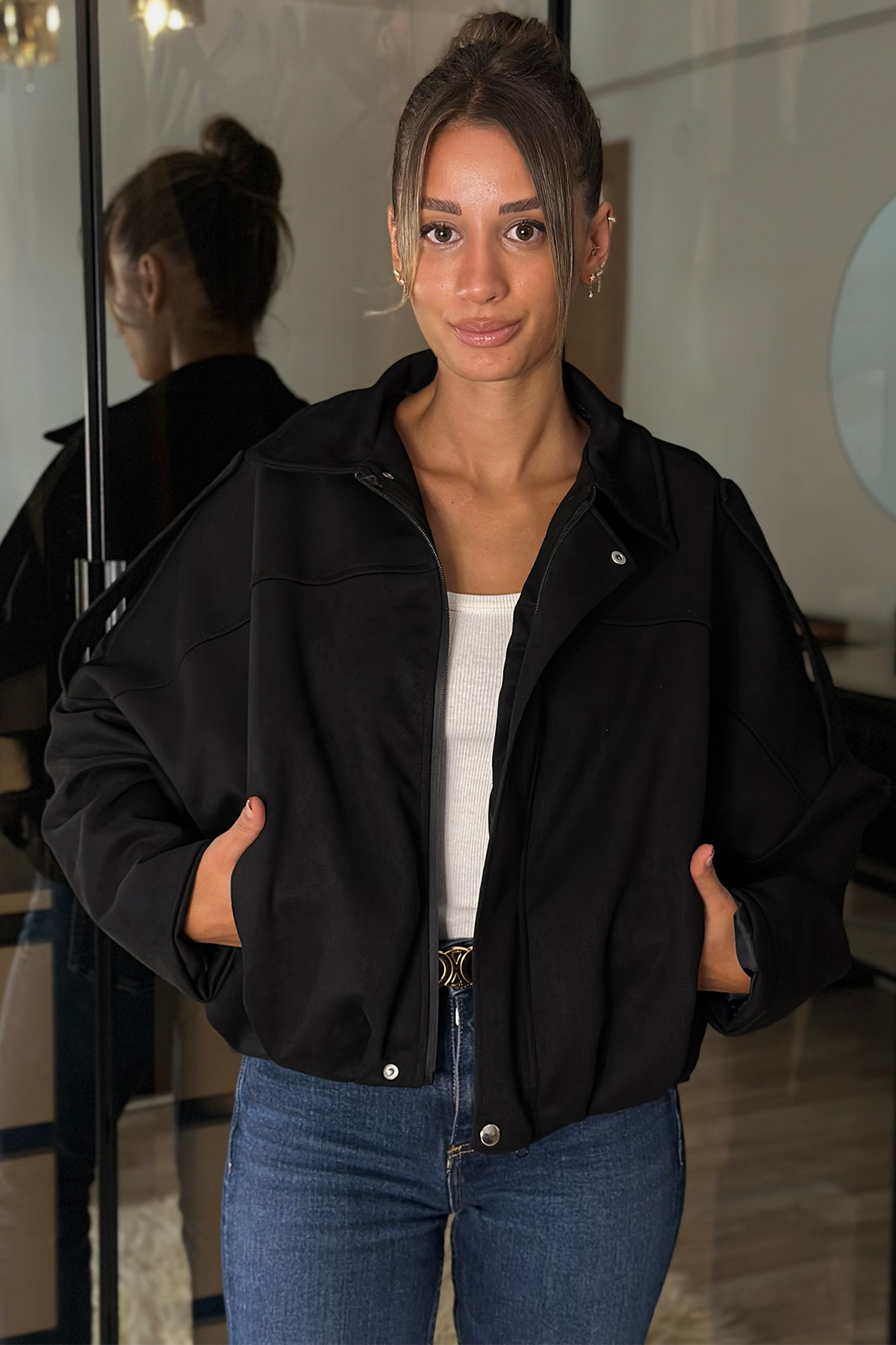 Oversize Kadın Bomber Siyah Süet Deri Ceket Oversize Kadın Bomber Siyah Süet Deri Ceket Beyys-Bomber-Süet XL
