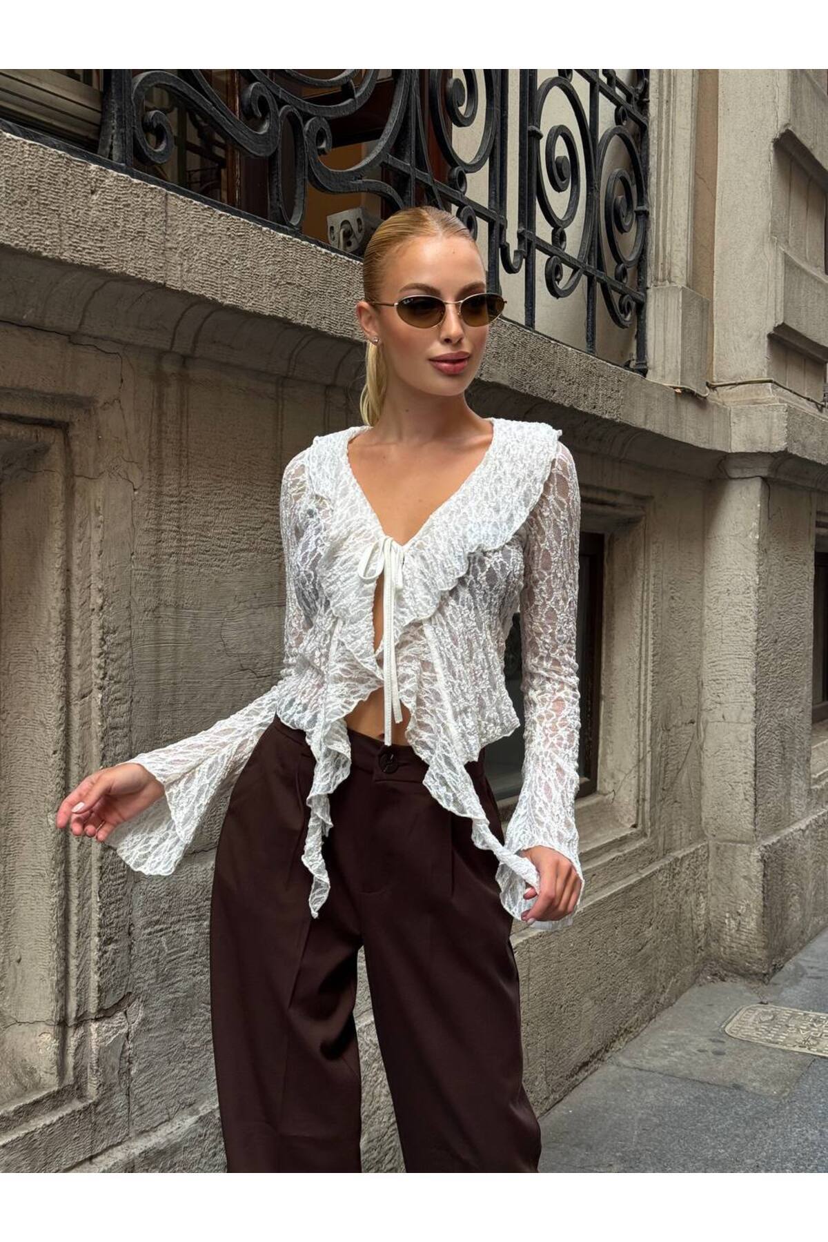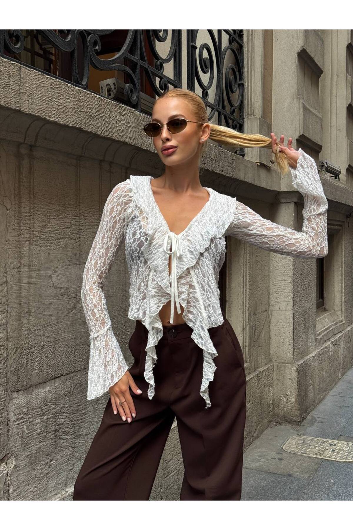 Sevunera Pervazlı Dantel İşlemeli Dekolteli Beyaz Renkli Crop Bluz Sevunera Pervazlı Dantel İşlemeli Dekolteli Beyaz Renkli Crop Bluz Sevunerazec3 L