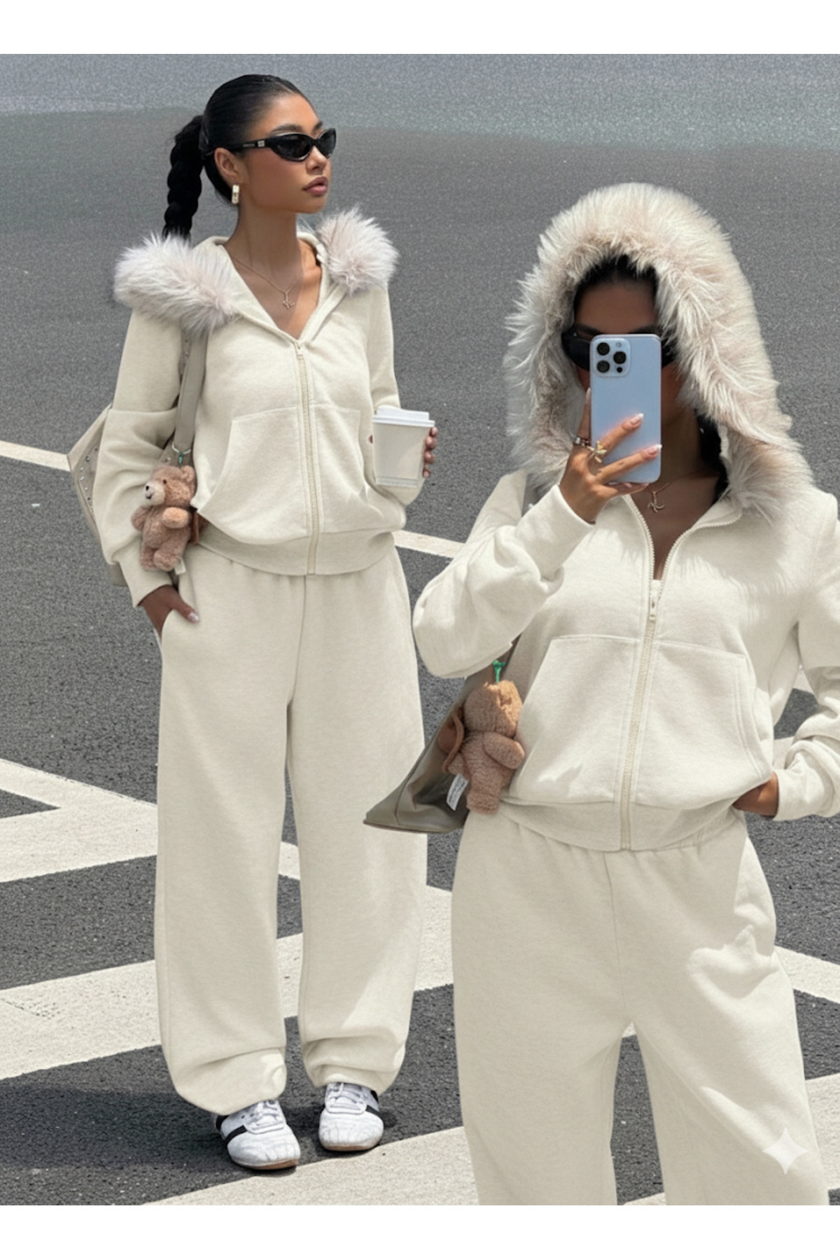 Kadın Gri Fermuarlı Kapüşonlu Sweatshirt Eşfoman Takımı – Kürklü Kapüşon, Cepli, Rahat Kalıp Kadın Gri Fermuarlı Kapüşonlu Sweatshirt Eşfoman Takımı – Kürklü Kapüşon, Cepli, Rahat Kalıp AFRISTKM1 2XL
