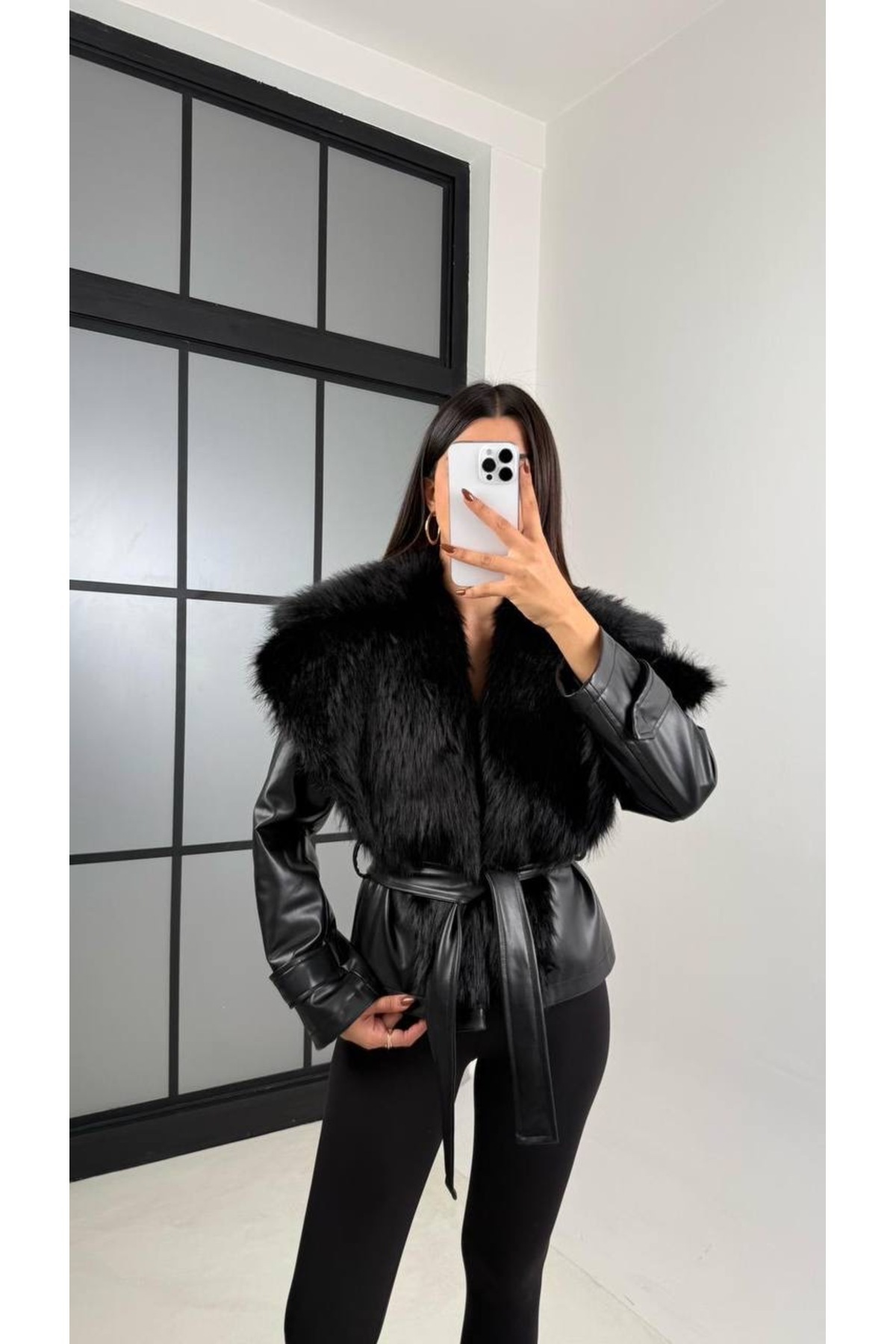 Siyah Kürk Yaka Bağlamalı Deri Ceket Siyah Kürk Yaka Bağlamalı Deri Ceket TH65798746 L