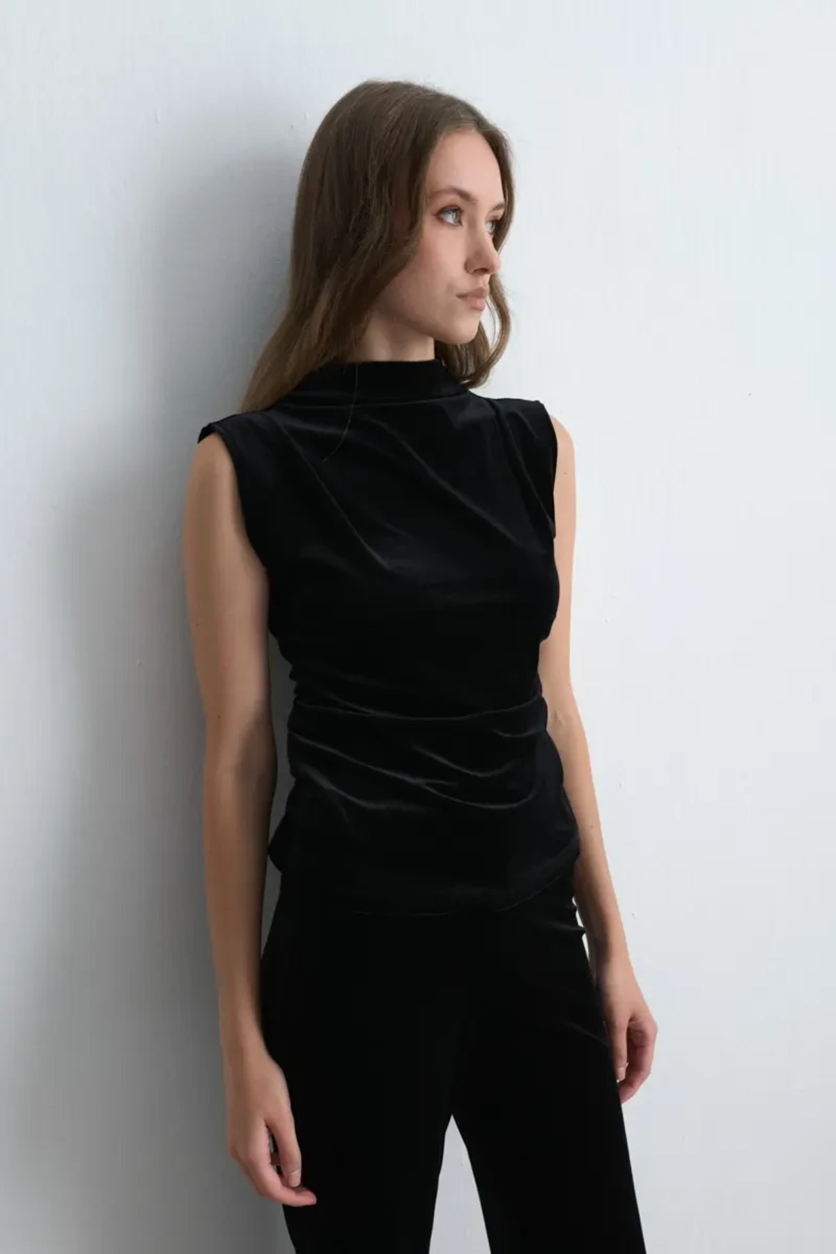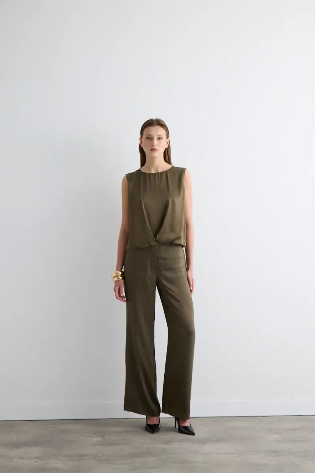 Önü Pileli Kolsuz Saten Bluz - Haki Önü Pileli Kolsuz Saten Bluz - Haki 26KG003516 XL