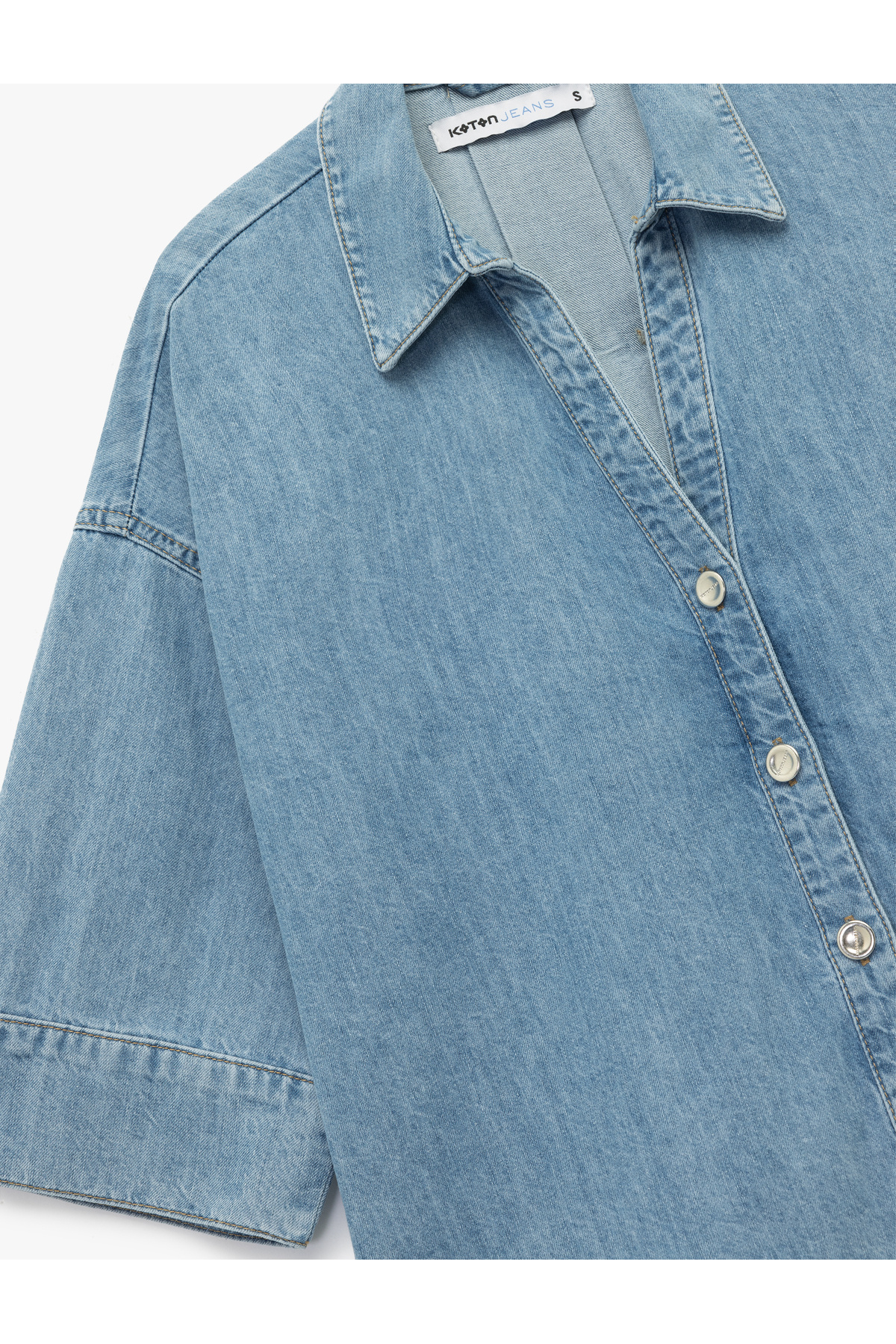 Oversize V Yaka Pamuklu Yarım Kollu Jean Gömlek Oversize V Yaka Pamuklu Yarım Kollu Jean Gömlek 6WAL60006MD L