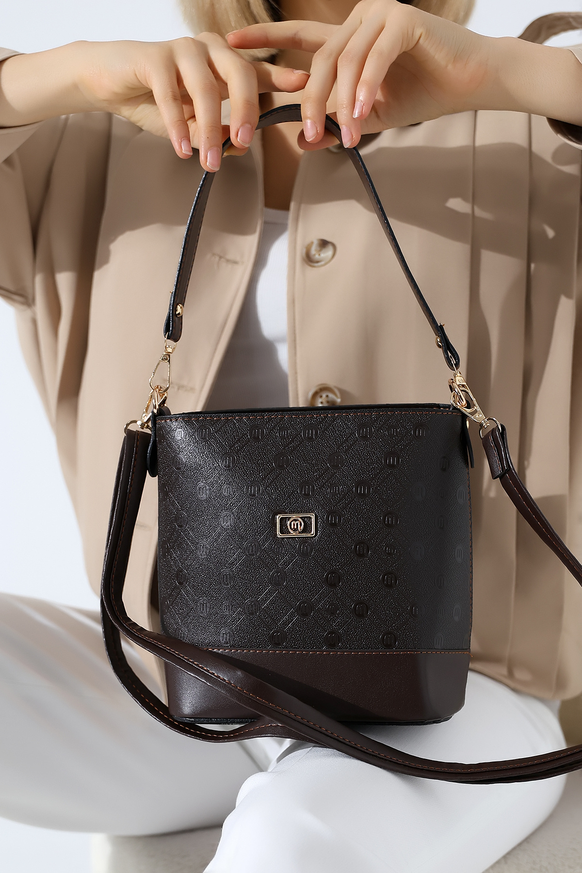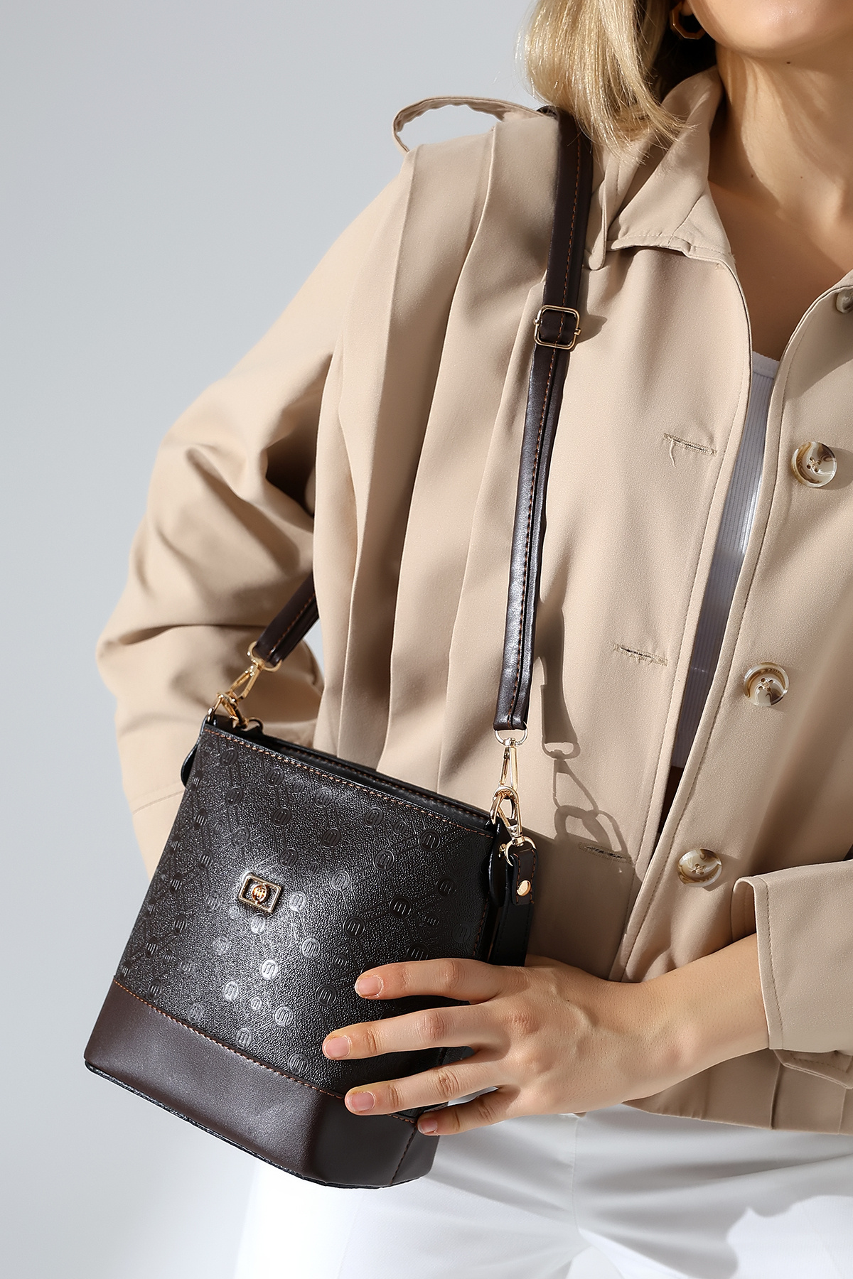 Kahverengi Kadın Çanta Baskılı Kova Model Tek Gözlü Çapraz Askılı Omuz ve El Çantası Kahverengi Kadın Çanta Baskılı Kova Model Tek Gözlü Çapraz Askılı Omuz ve El Çantası BLZKOVA01 Standart
