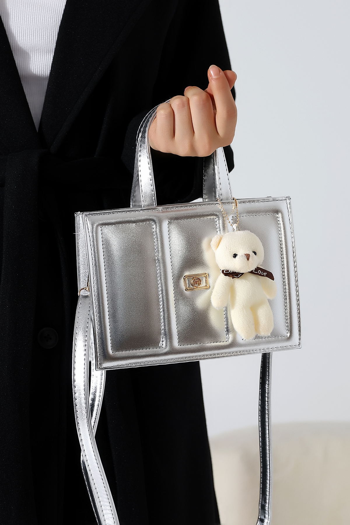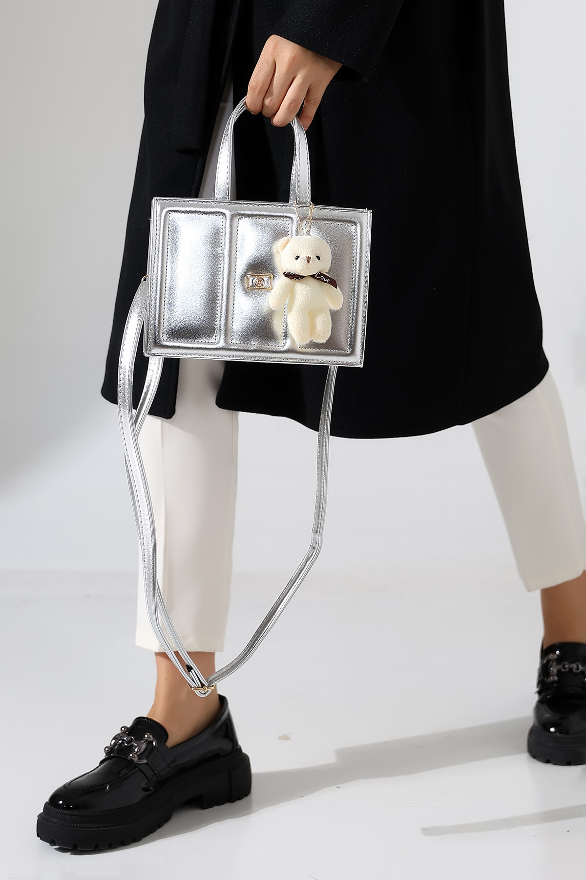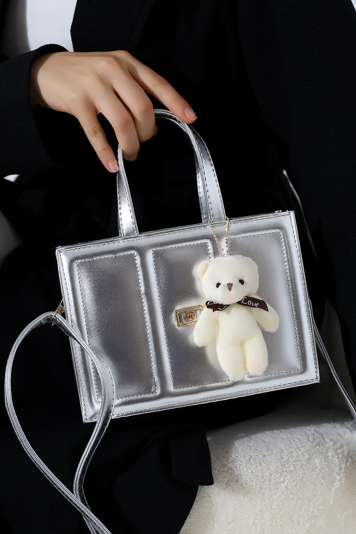 Gümüş Kadın Çanta Küçük Boy Kutu Model Ayıcıklı Çapraz Askılı Omuz ve El Çantası Gümüş Kadın Çanta Küçük Boy Kutu Model Ayıcıklı Çapraz Askılı Omuz ve El Çantası BLZ-AYICIKLI Standart