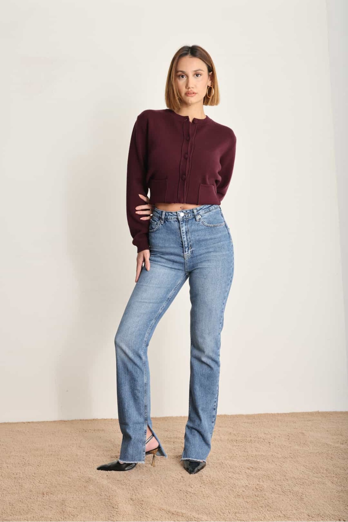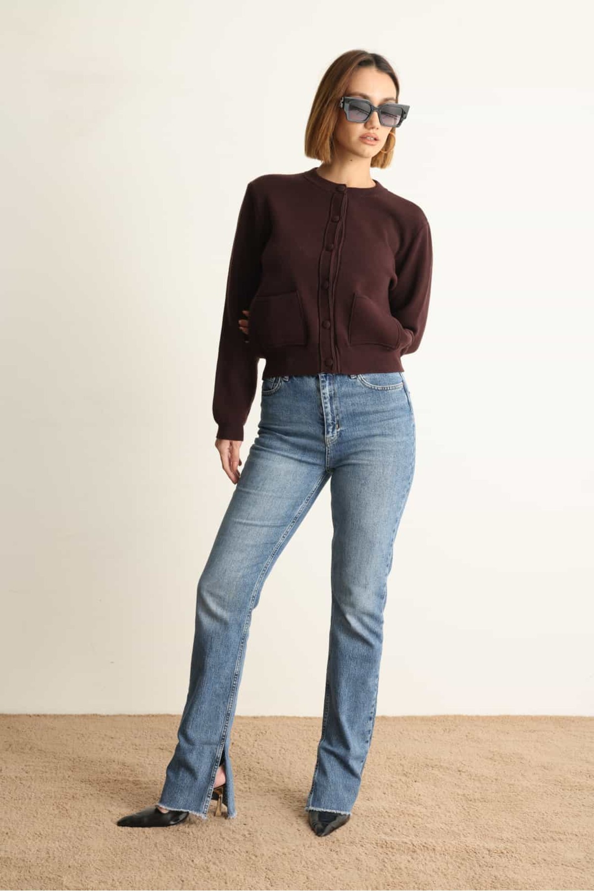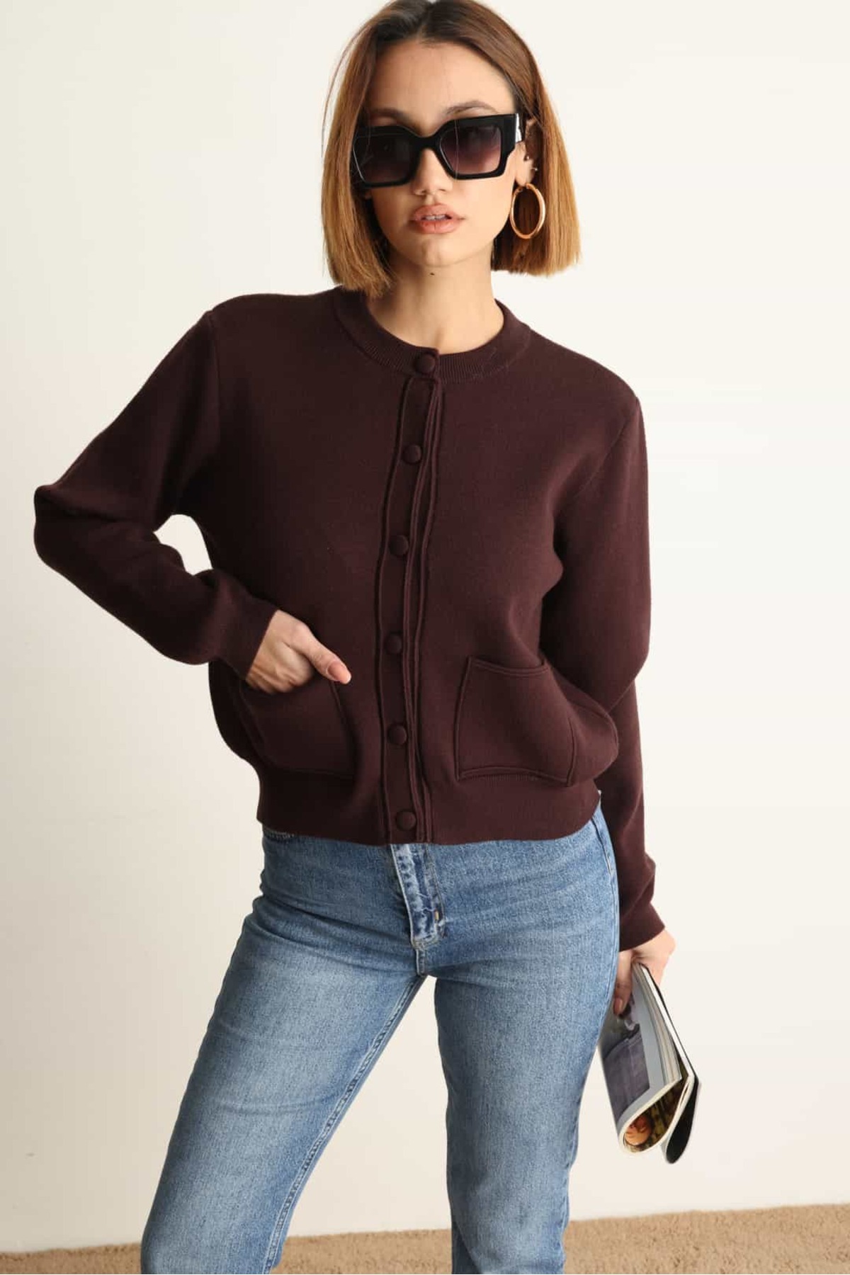 Düğmeli Triko Hırka Kahverengi Düğmeli Triko Hırka Kahverengi 25BLK001 L