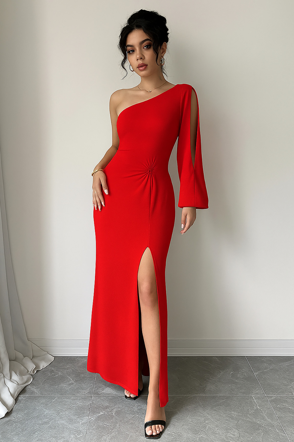Siyah Kadın Tek Omuz Uzun Kollu Yırtmaç Detay Krep Kumaş Uzun Elbise Siyah Kadın Tek Omuz Uzun Kollu Yırtmaç Detay Krep Kumaş Uzun Elbise DFX398490 XL