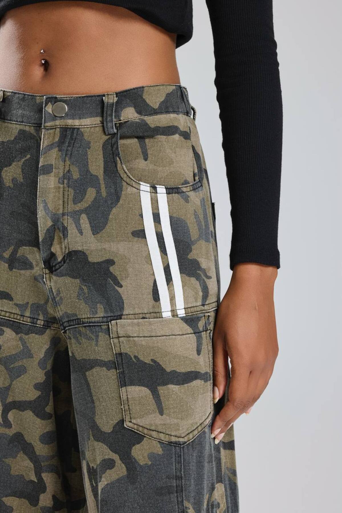 Kadın Kamuflaj Kumaş Şerit Detaylı Tasarım Pantolon Kadın Kamuflaj Kumaş Şerit Detaylı Tasarım Pantolon TW3-M58219 L
