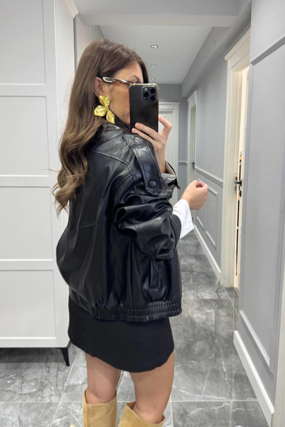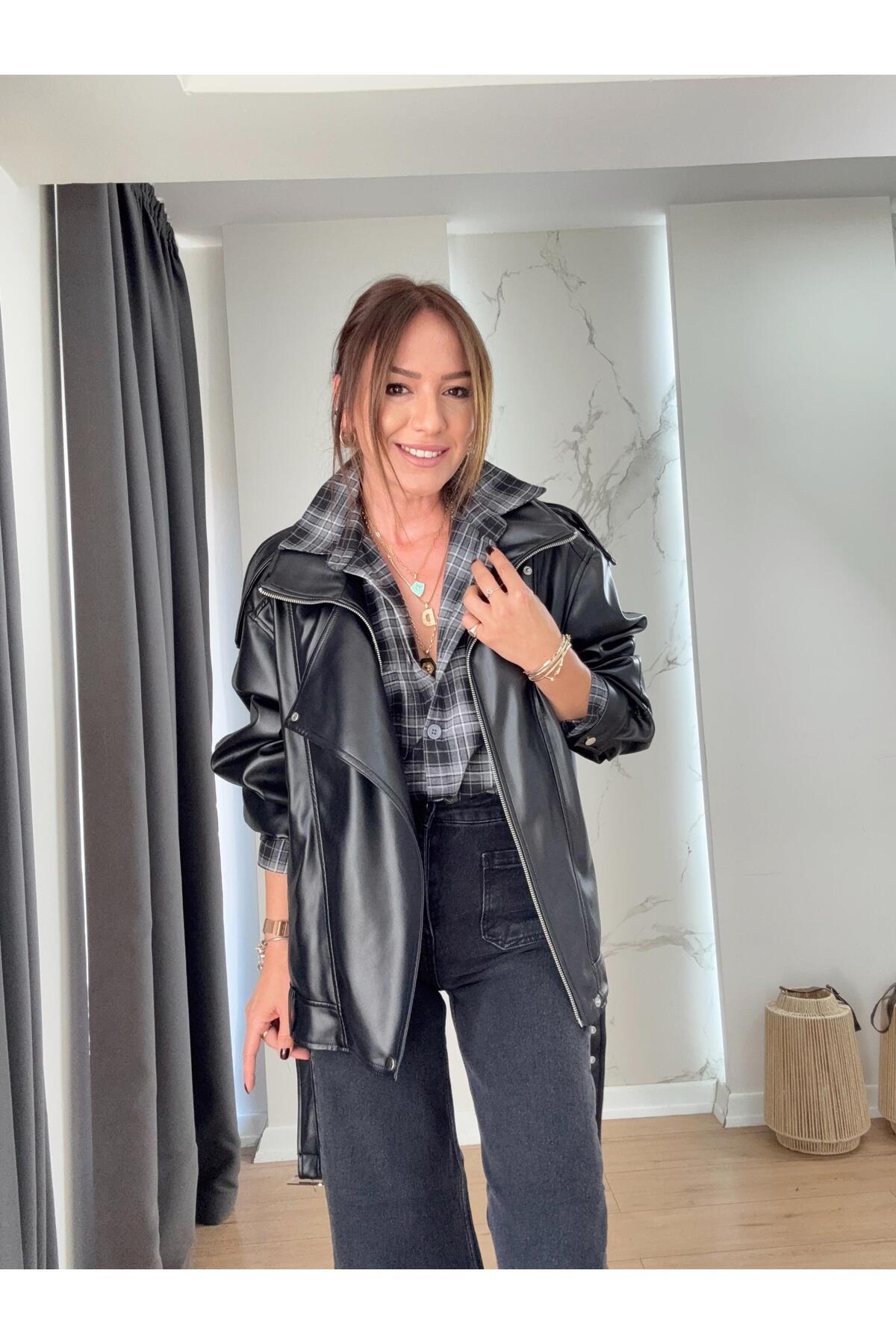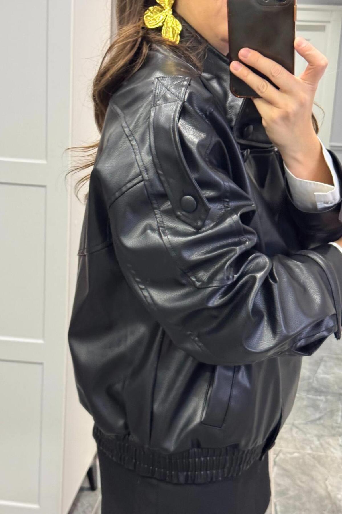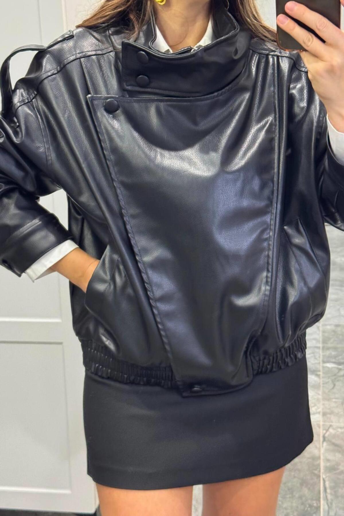 Dik Yakalı Tasarım Kruvaze Deri Ceket Siyah Dik Yakalı Tasarım Kruvaze Deri Ceket Siyah BA25SKDG016 L