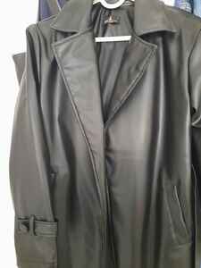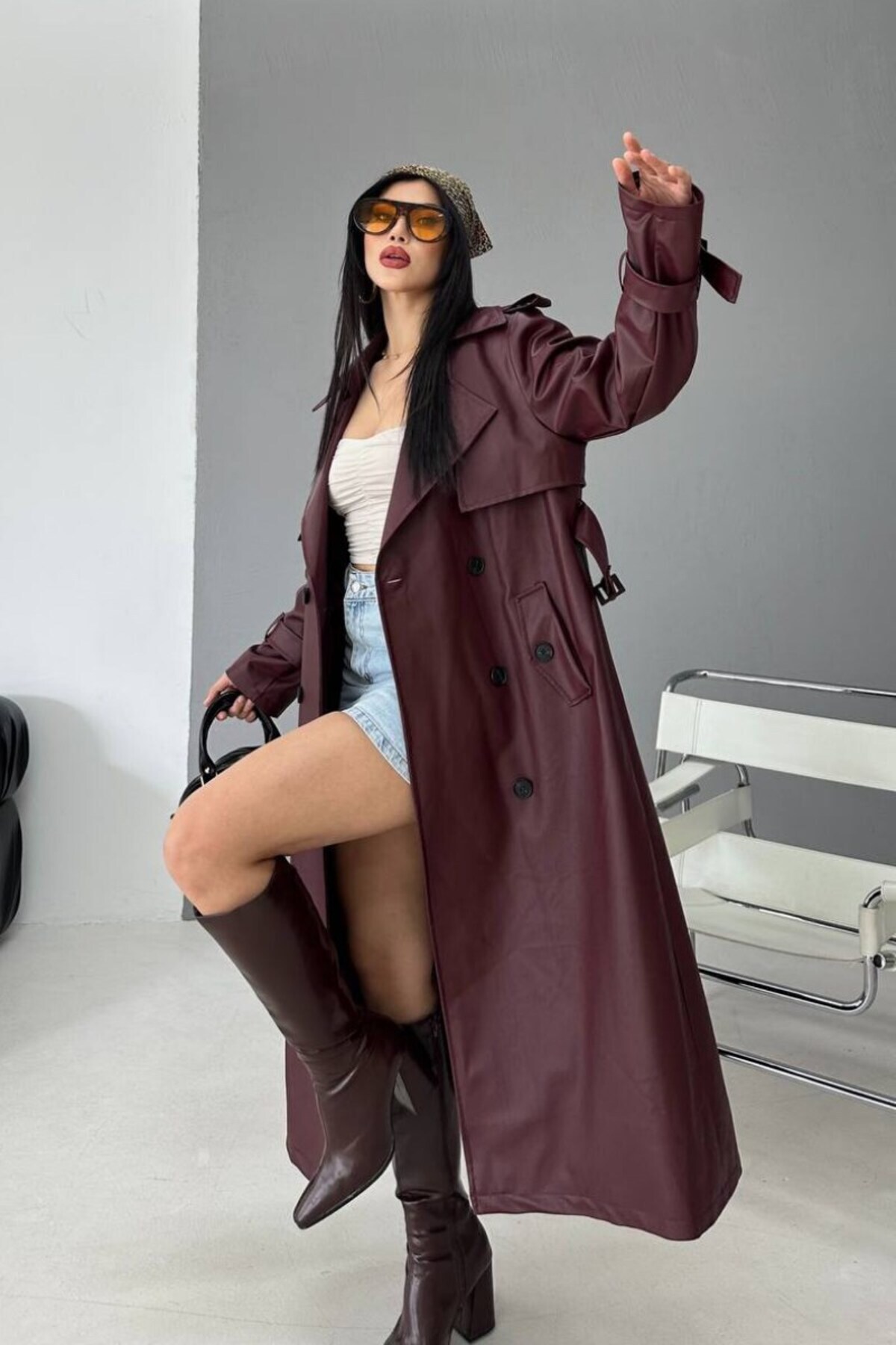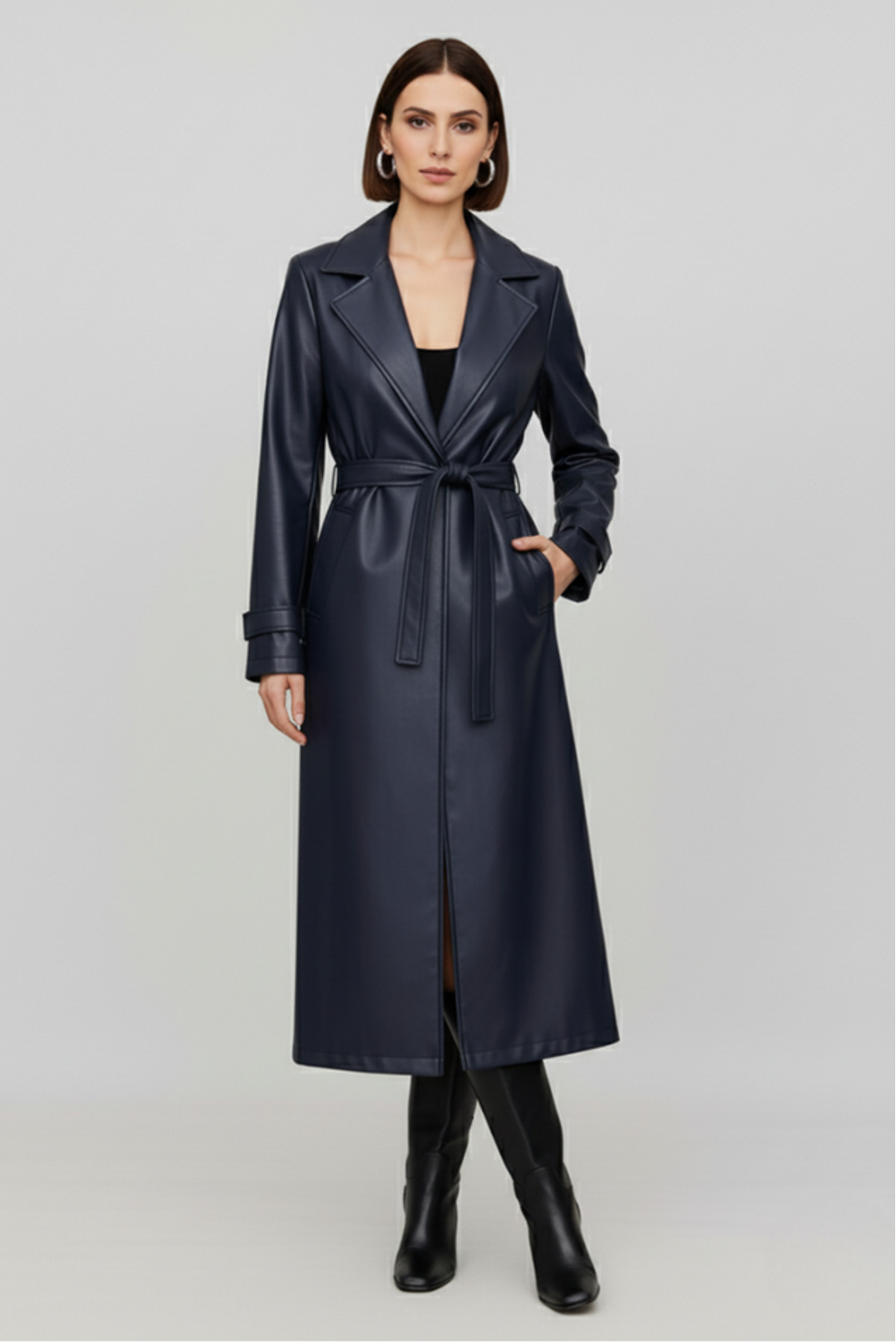 Kadın Kuşaklı Astarlı Cepli Uzun Deri Trençkot Kadın Kuşaklı Astarlı Cepli Uzun Deri Trençkot ZR250923277 XL